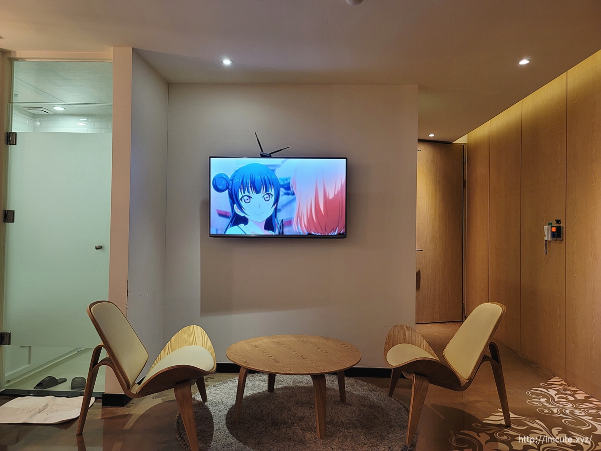 tv프로그램 중에서 보고 싶은 것을 틀어서 보면 되고요 앞에 의자와 테이블 넘 감각적인 디자인이더라고요.