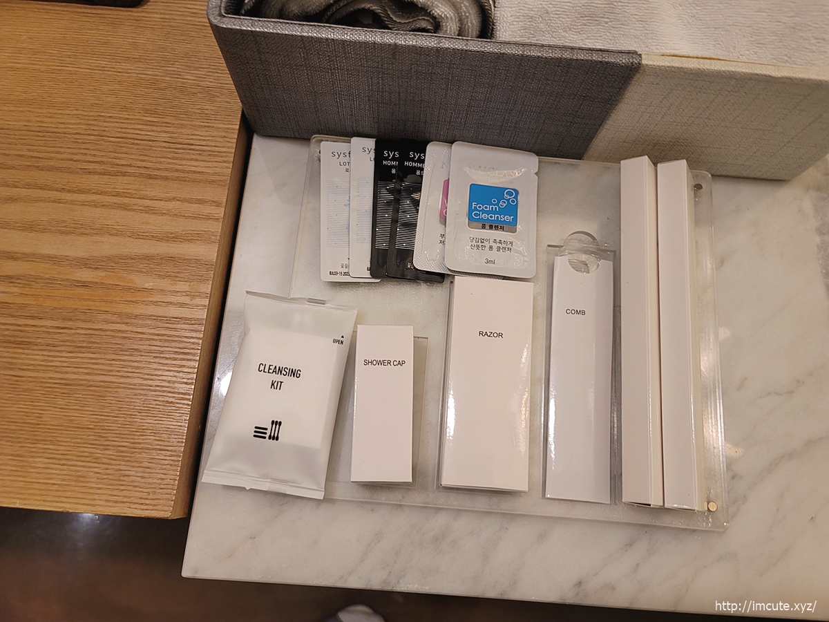 클렌징 키트와 샤워캡, 면도기, 빗, 폼클렌저 등 일회용품 입니다.