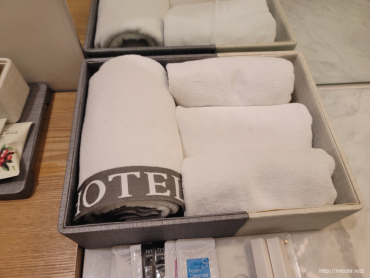 큰 타올과 작은 수건 여러 개! 호텔에 오면 위생상태를 가늠할 수 있는 요소중 하나가 바로 타올인데 나쁘지 않아요