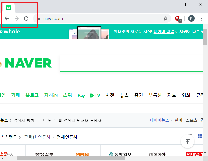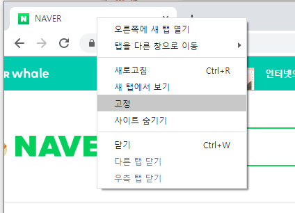 원하는 사이트에 들어간 후"고정"버튼을 누르면 된다. 예를 들어 나는 포탈 사이트 네이버를 탭 고정을 해보겠다.