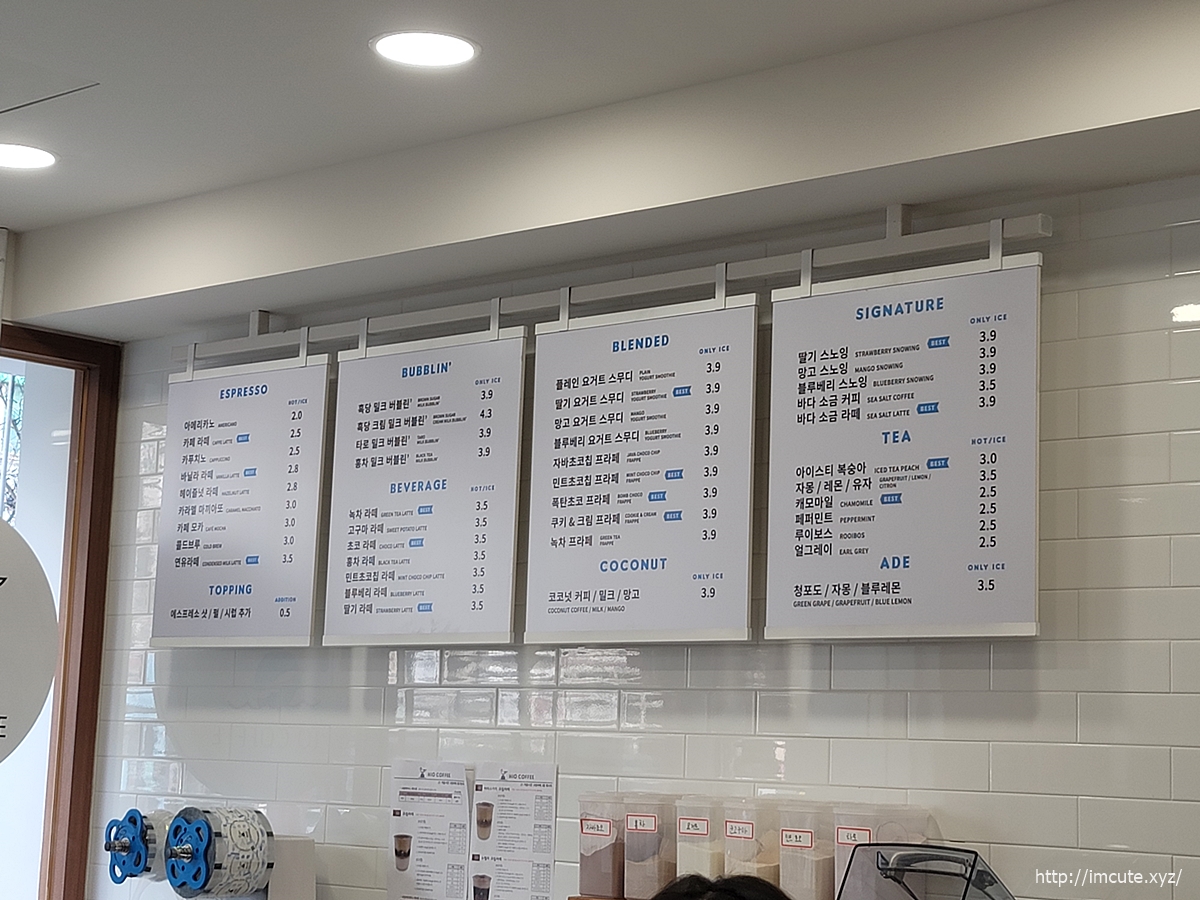 시그니처 메뉴로 딸기스노잉, 망고스노잉,블루베리스노잉,바다소금커피,바다소금라떼, 코코넛커피/밀크/망고, 청포도/자몽/블루레몬에이드, 아이스티 복숭아, 자몽/레몬/유자티, 캐모마일, 페퍼민트, 루이보스, 얼그레이가 있었어요.