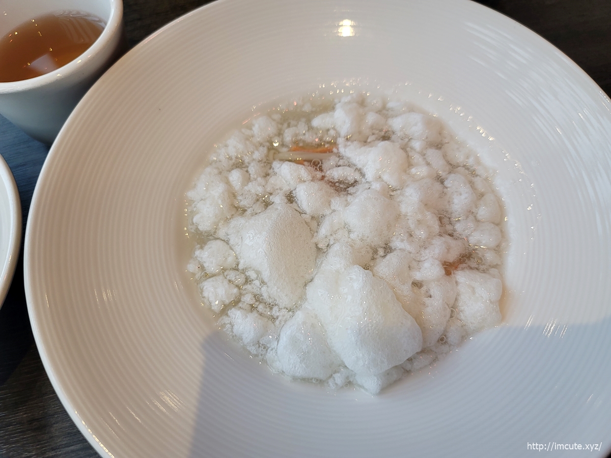 스프는 굉장히 독특하게 생겼어요. 위에 계란이 머랭처럼 올라가이있어요.