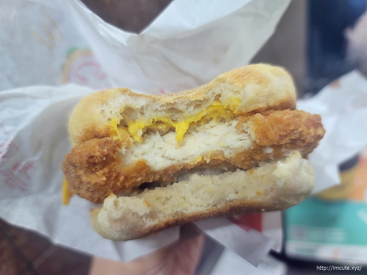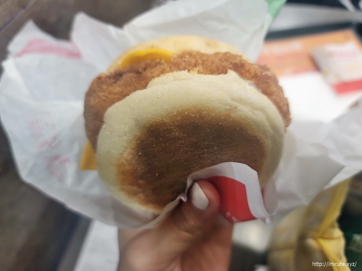 맥모닝의 꽃 잉글리쉬 머핀 반 뚝! 갈라서 안에는 닭고기 패티(치킨) 그리고 치즈 한장까지~
