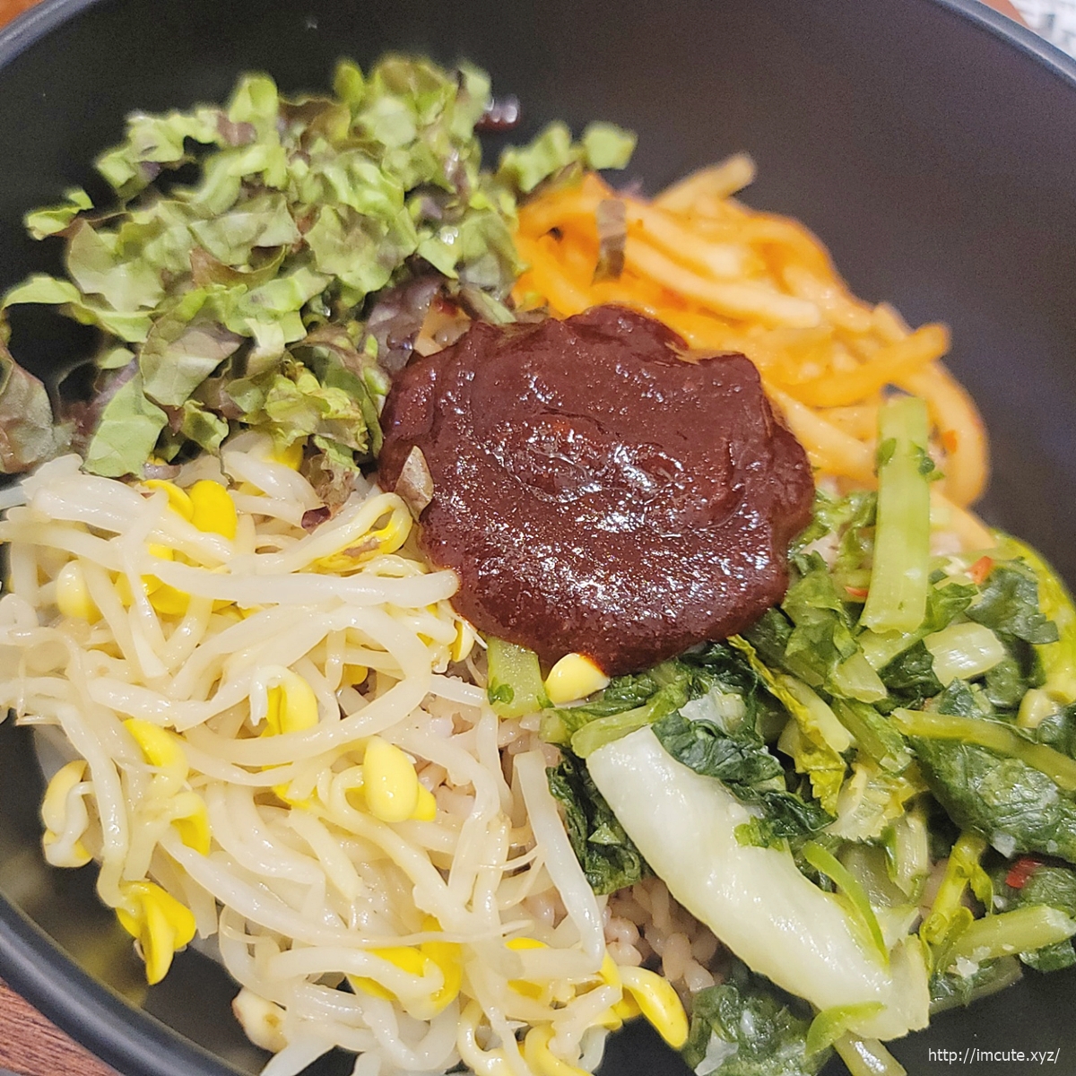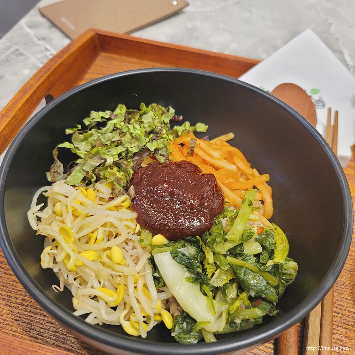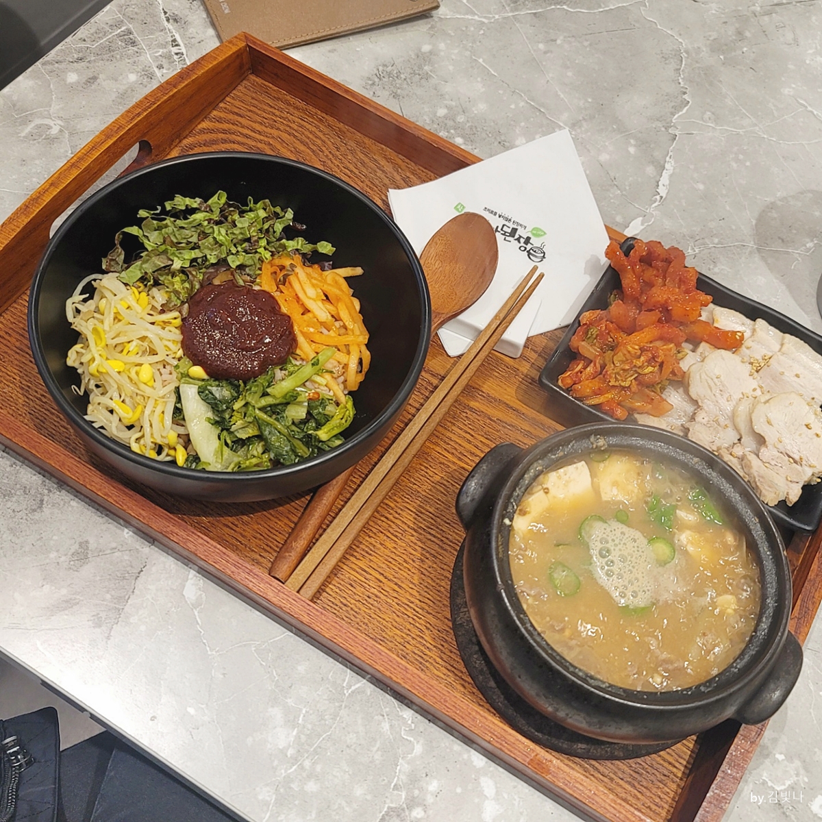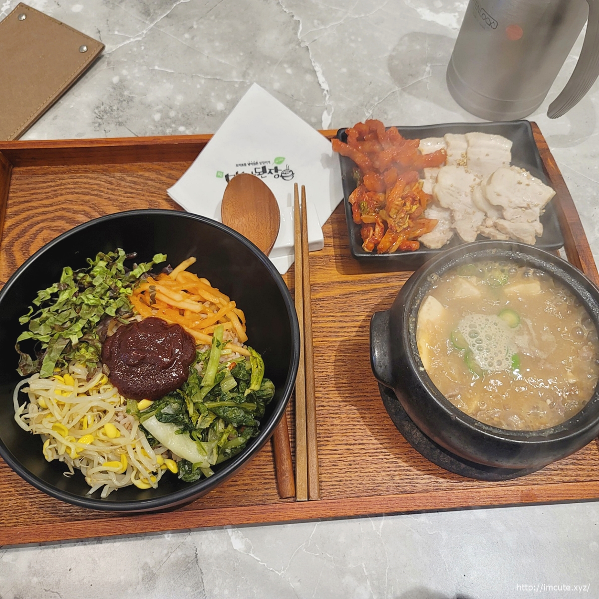 역시 한국인은 밥심인데 다채로운 토핑이 얹어져 있는 비빔밥에 된찌 그리고!!!! 수육까지 함께하니 이거 완전 임금님 수라상 같더라고요..ㅎㅎㅎ