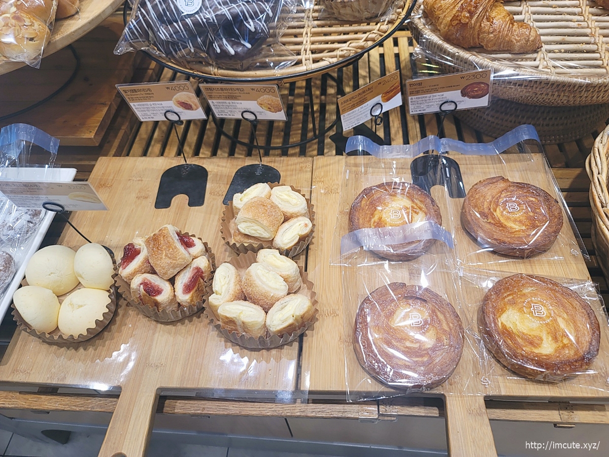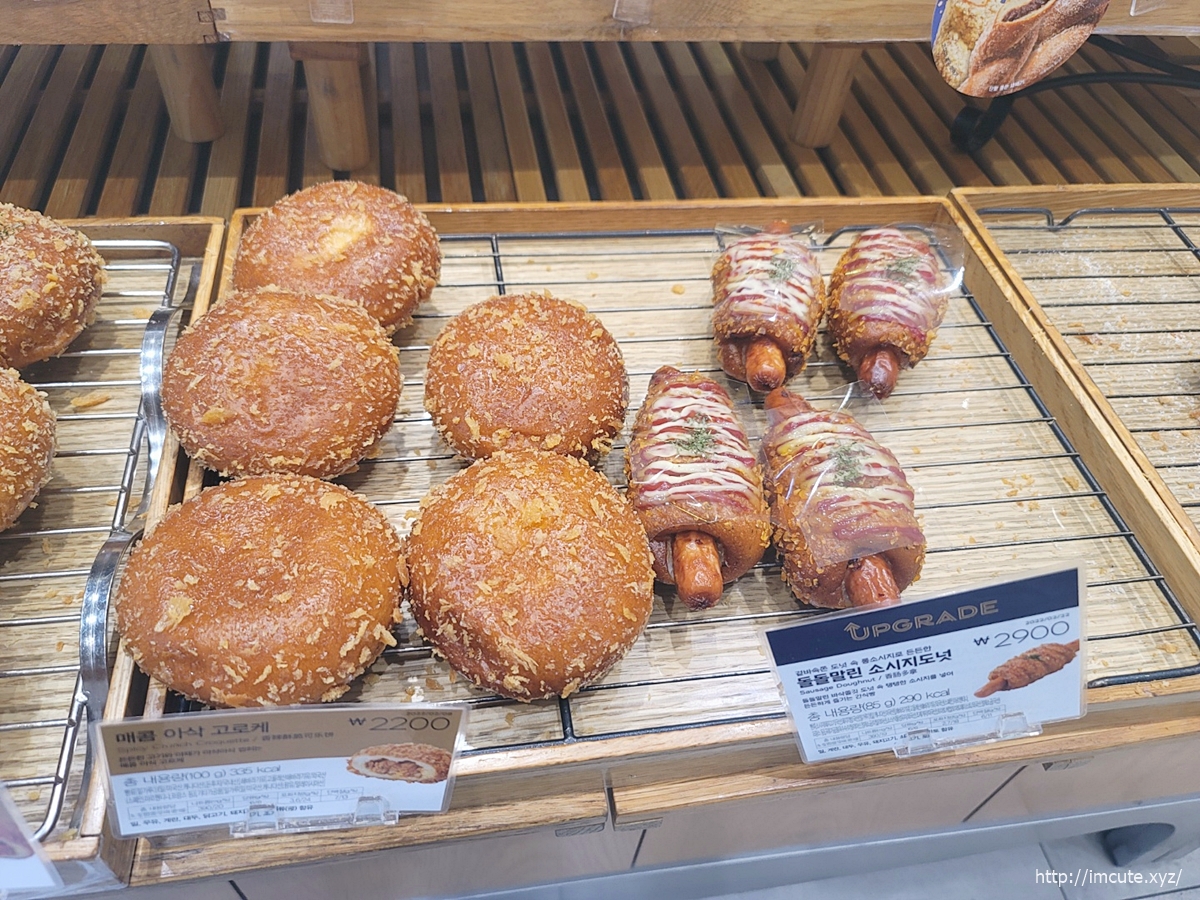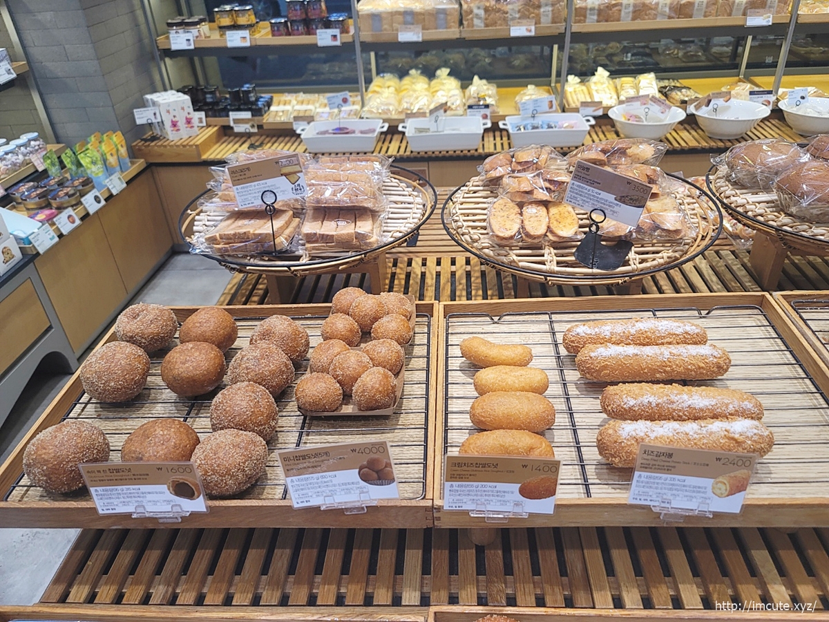 확실히 빵 전문점이라 소개해도 끝이 없네요~~ 찹쌀도넛은 1600원, 미니 찹쌀도넛은 그냥 찹쌀도넛보다 좀더 작은 크기에 5개세트가 4천원, 크림치즈 찹쌀도넛은 크림X찹쌀도넛의 없어서 못먹는 조합이죠. 가격은 착한 1400원!! 그리고 맨 오른쪽의 치즈감자빵은 실패할수 없는 치즈와 감자의 만남입니다..가격은 2400원이고요 하나만 먹어도 든든해보여요.