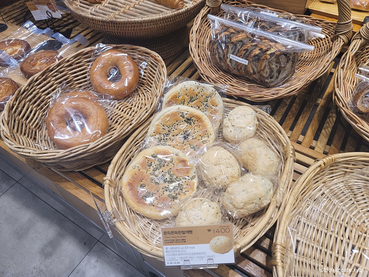 그외에도 쫀득쫀득한 찰깨빵이 1400원, 씨앗호떡 서타일의 빵이라든가 베이글이 엿보였어요.