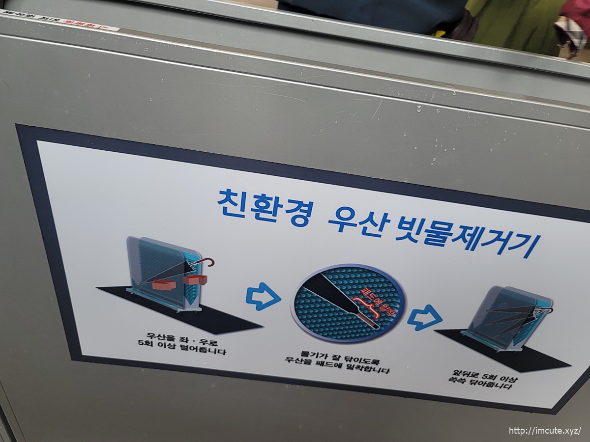 친환경 우산 빗물제거기로 우산의 빗물을 제거하고, 덧신을 신고 입장합니다.