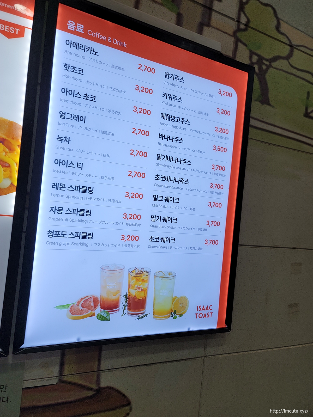 핫초코 아이스 초코, 키위주스와 딸기주스, 애플망고주스는 3200원입니다.