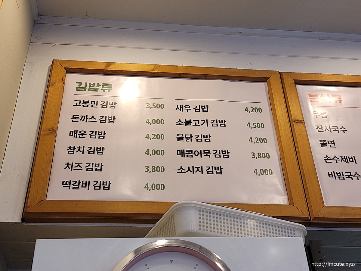 매콤어묵 김밥은 3800원이고요 치즈김밥도 같은 가격입니다.
