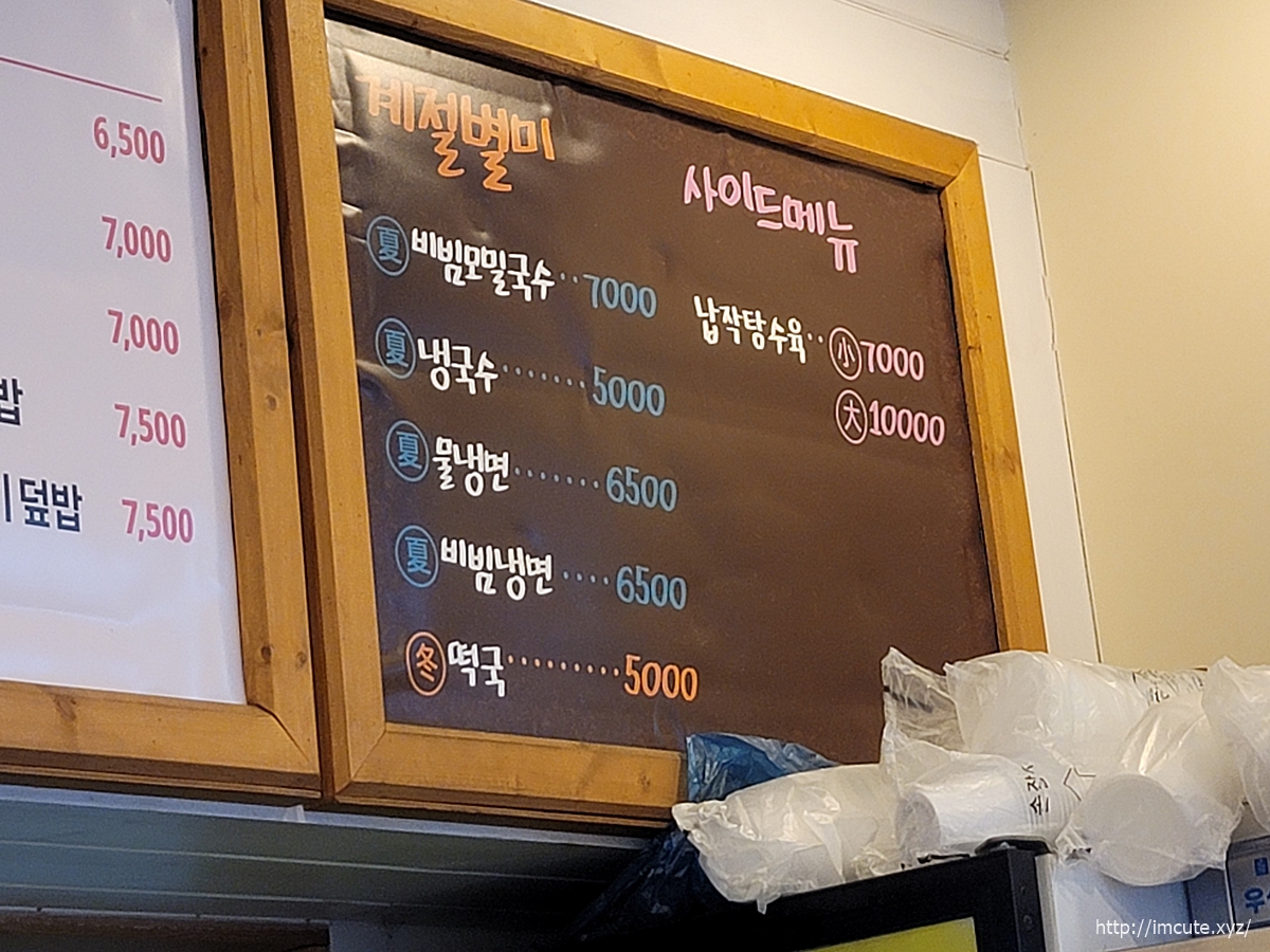 냉국수가 5천원, 물냉면과 비빔냉면이 각각 6500원입니다.