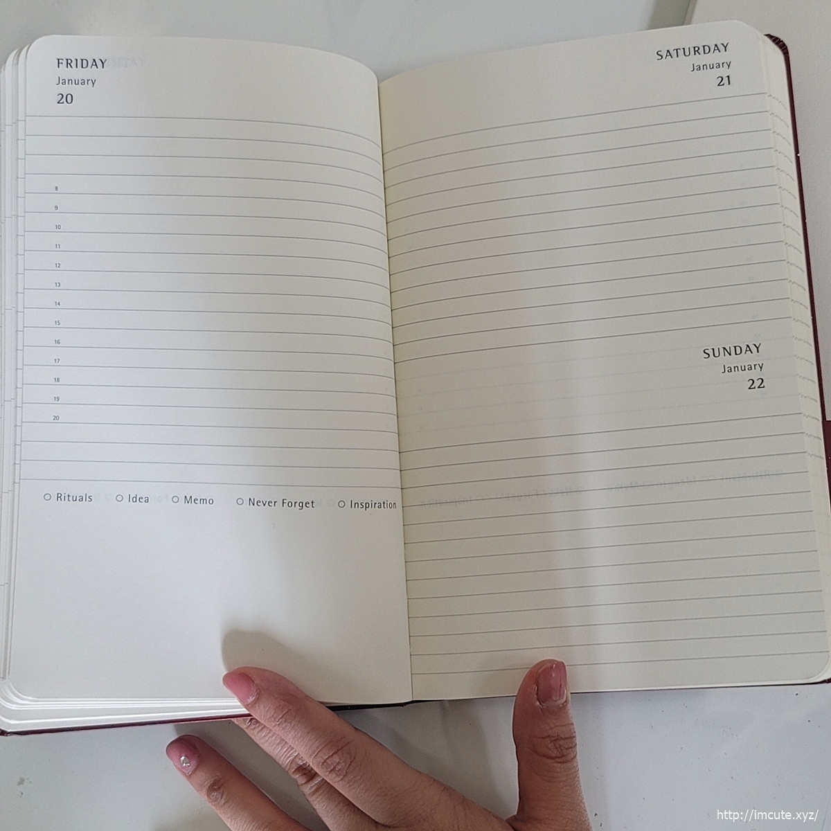 또한 그냥 레드빛깔이 아니라 뭔가 비듬..아니 눈이 흩뿌려져 있는 느낌적인 느낌을 담아서 신시어 레드인 것일까요. 그냥 레드보다도 한 차원 더 고차원적인 무언가가 담겨있는 듯한 표지 색깔입니다. 살짝 가죽을 덧댄 느낌이라 따로 다이어리 위에 무언가로 보호하거나 하지 않아도 되어 튼튼해 보여요.