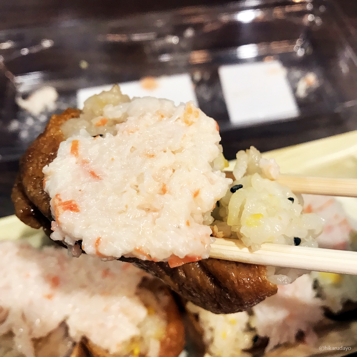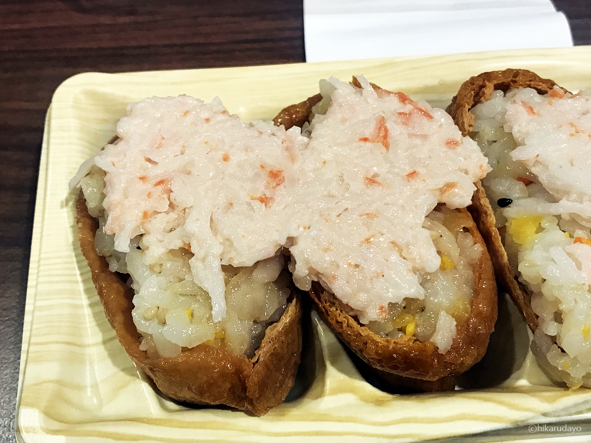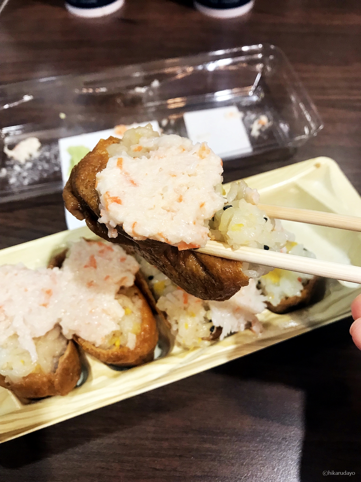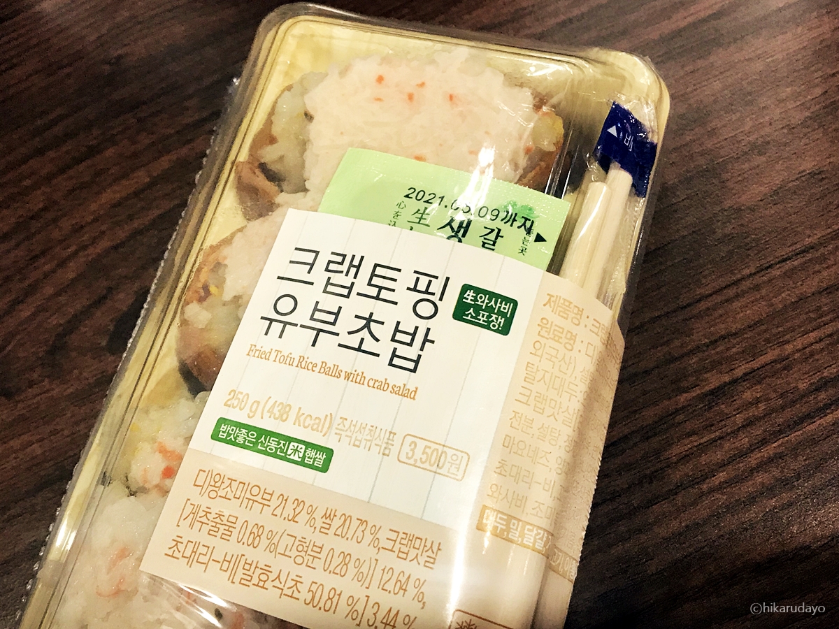 조미유부이지만 각종 양념과, 실한 토핑이 들어있어서 그런지 칼로리는 500에 준하게 되는 편. 그래도 이정도 칼로리에 육박하더라도 단순히 탄수화물양만 늘린것이 아니라 아주 좋은 단백질인 유부에~ 크랩토핑까지 있으니 이거 해산물과 식물성 단백질 두루두루 갖춘 거 아니냐. 그래서 감사해하며 먹었다.