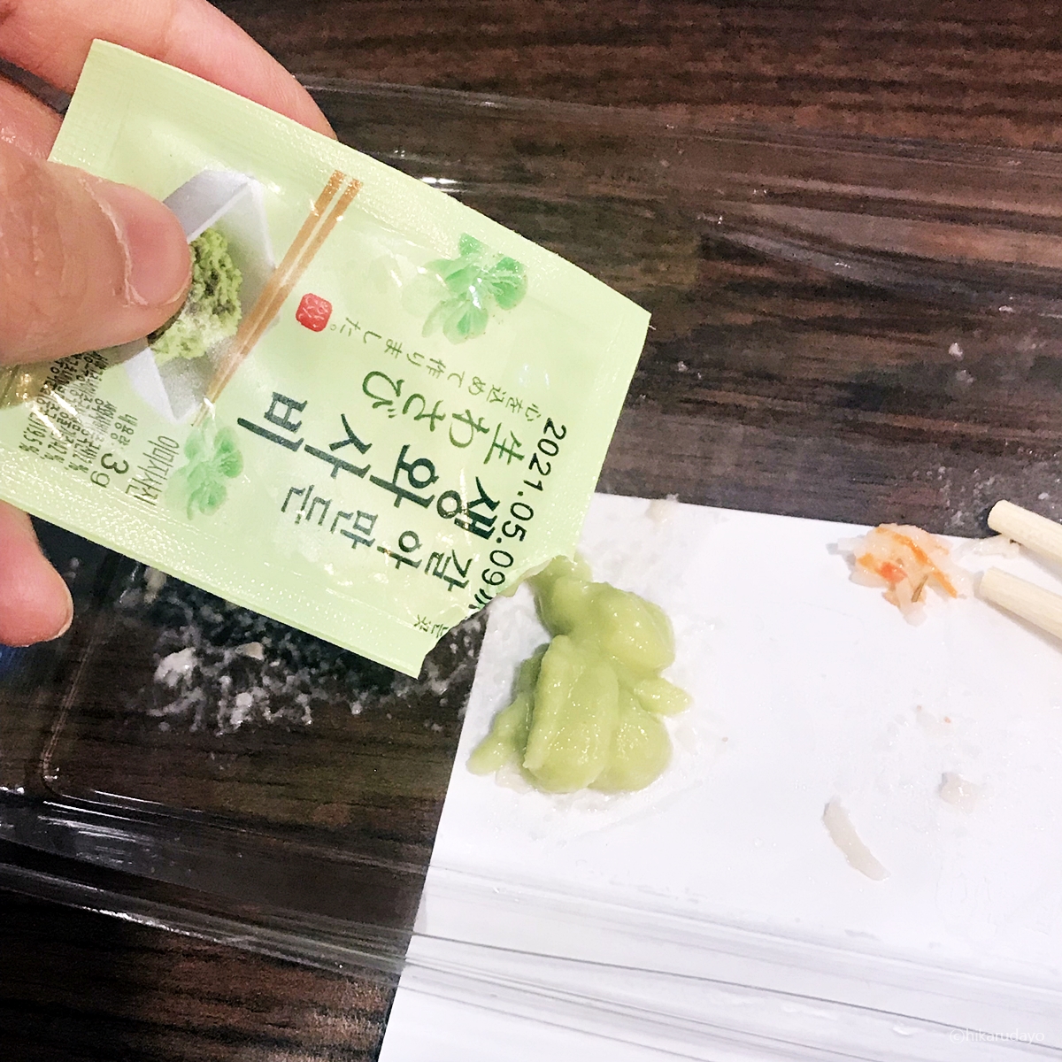 생 와사비는 뚜껑에다가 짜 보았다. 뚜껑을 나름 유용하게 사용할 수 있다.