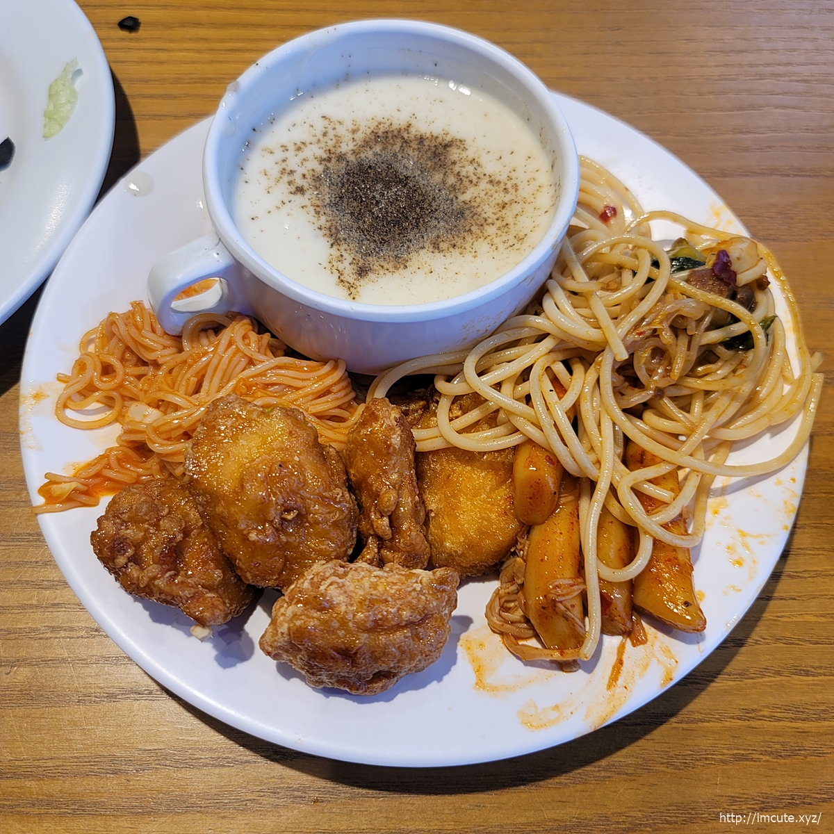 피자에 볶음밥, 떡볶이, 튀김, 스프, 스파이시 쫄면등 다 먹을 수 있으니 얼마나 좋아요~