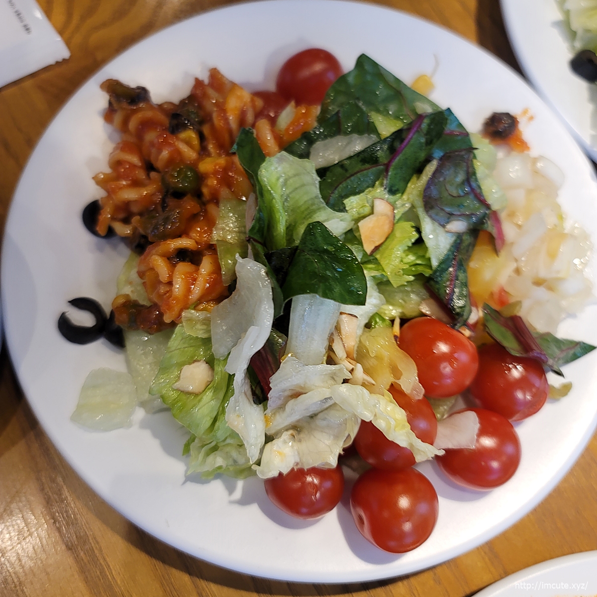 식전 샐러드죠~ 올리브 가득 넣어서 푸릇푸릇 양배추와 함께 방울토마토 가득가득 담아왔어요.