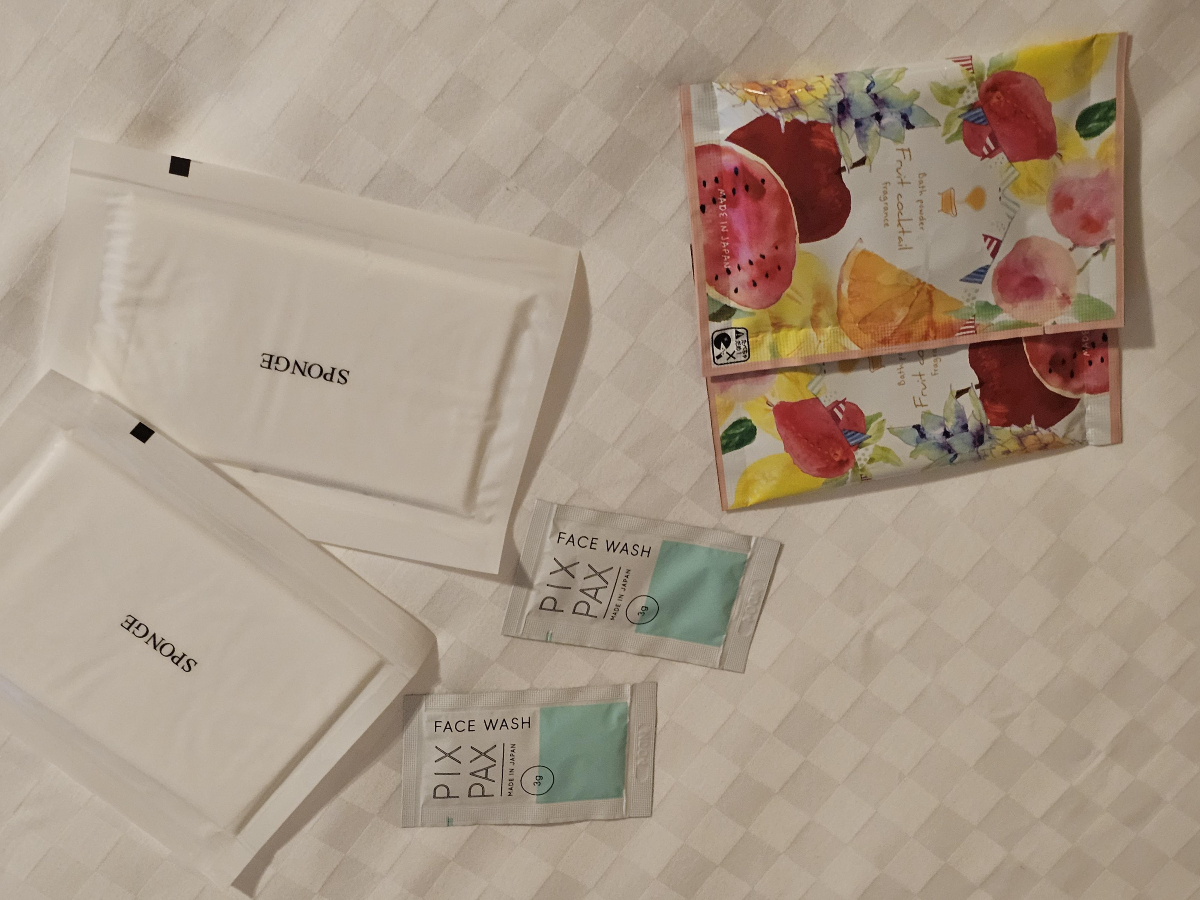 목욕 스펀지라든가 페이스워시, 그리고 입욕제! 나머지 치약 칫솔이나 여러가지 용품들은 집에서 가져온걸 쓰려고 해서