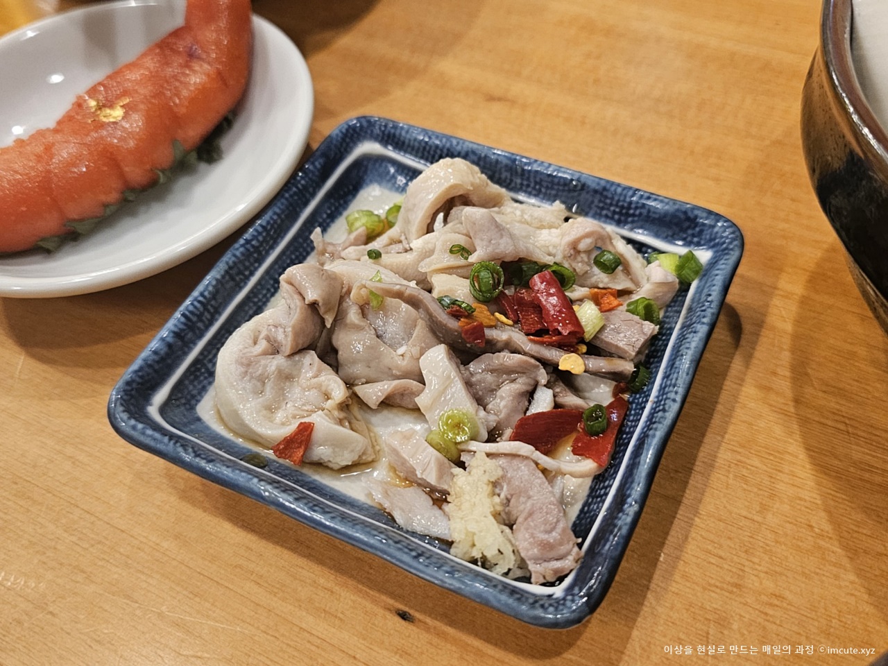 순대에 들어있는 그 내장 부위 맞죠? 근데, 너무 부드럽고 맛있어요! 약간 새콤한 맛도 나고. 이 음식은 대체 뭘까요? 다음에 가서 또 먹어보고 싶다.