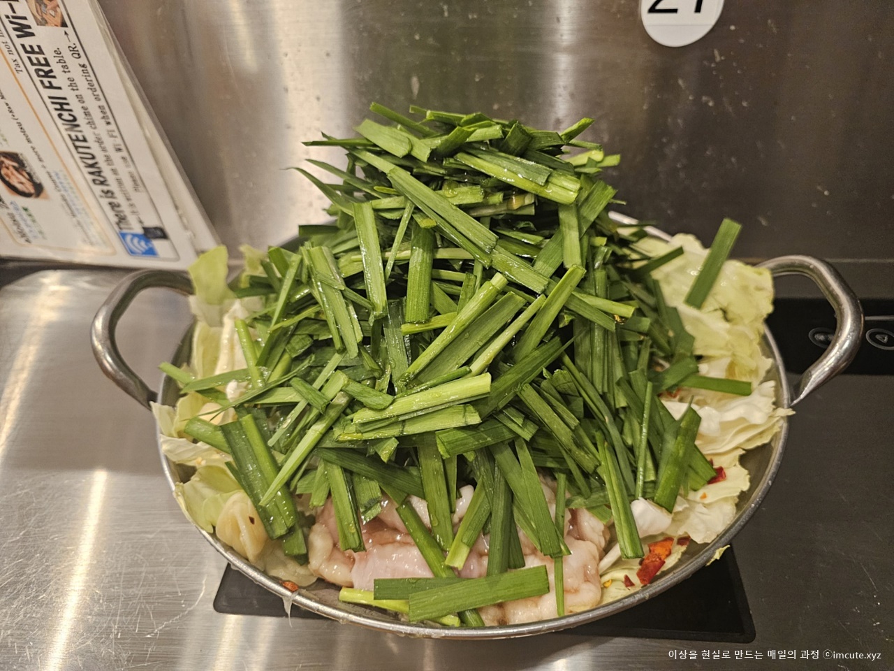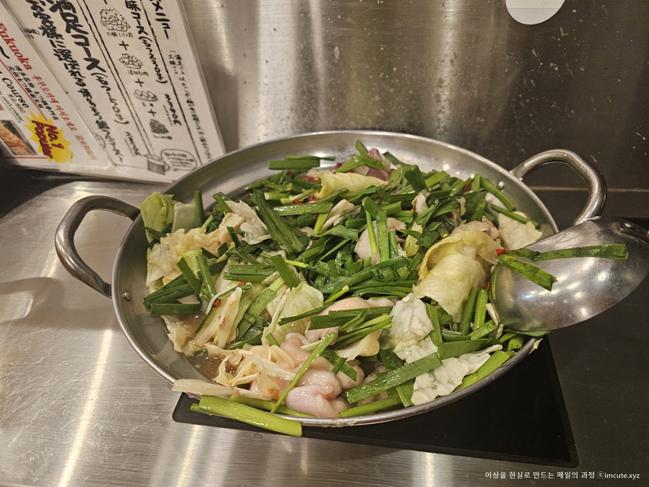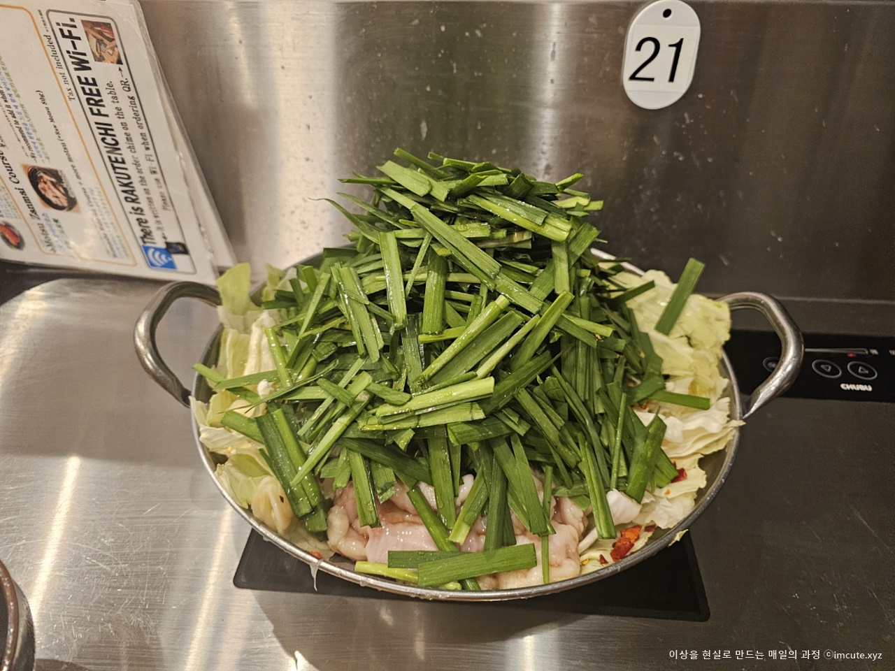 이렇게 부추가 산더미같이 쌓여있는 음식이 바로 모츠나베라고 합니다. 신기하쥬?