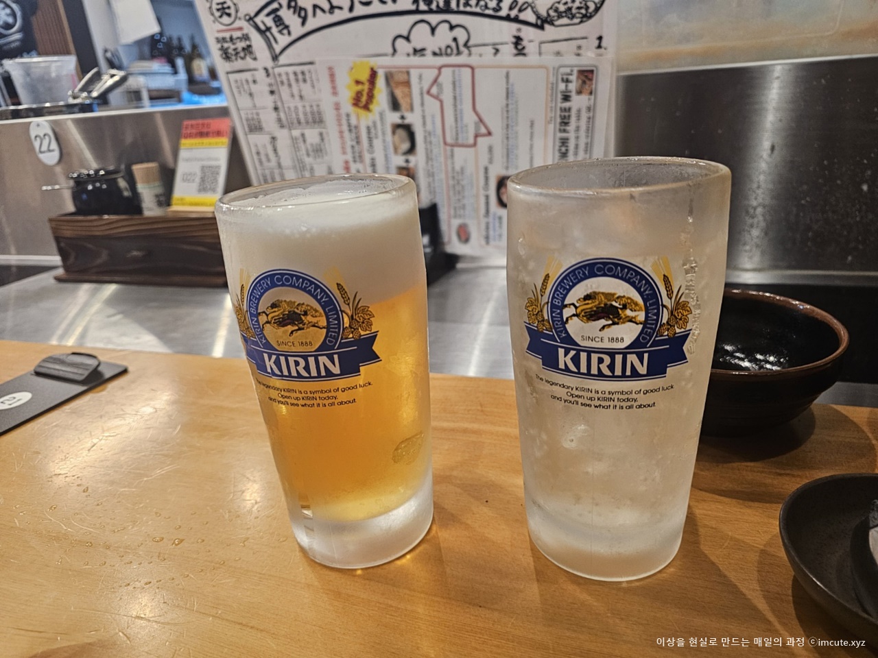 왼쪽은 맥주, 오른쪽은 뭐지? 나 뭐 먹었는지 까먹었어요..ㅠㅠ 찬물 달라고 했나.