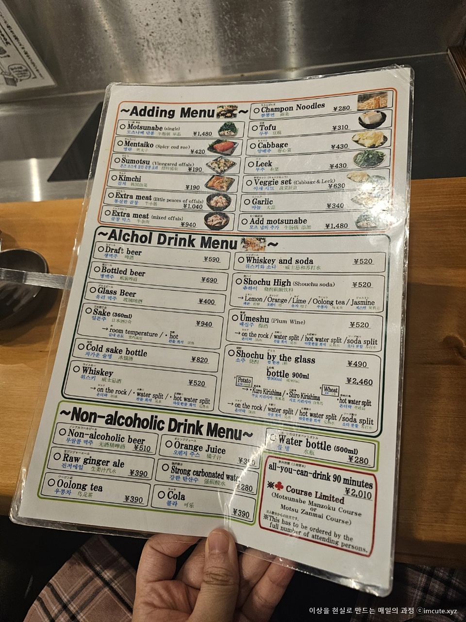 가격은 1인당 2850엔, 그리고 모츠잔마이코스는 1인당 3390엔으로, 모츠나베 만족코스에 곱창추가까지 !!(생곱창임!!)