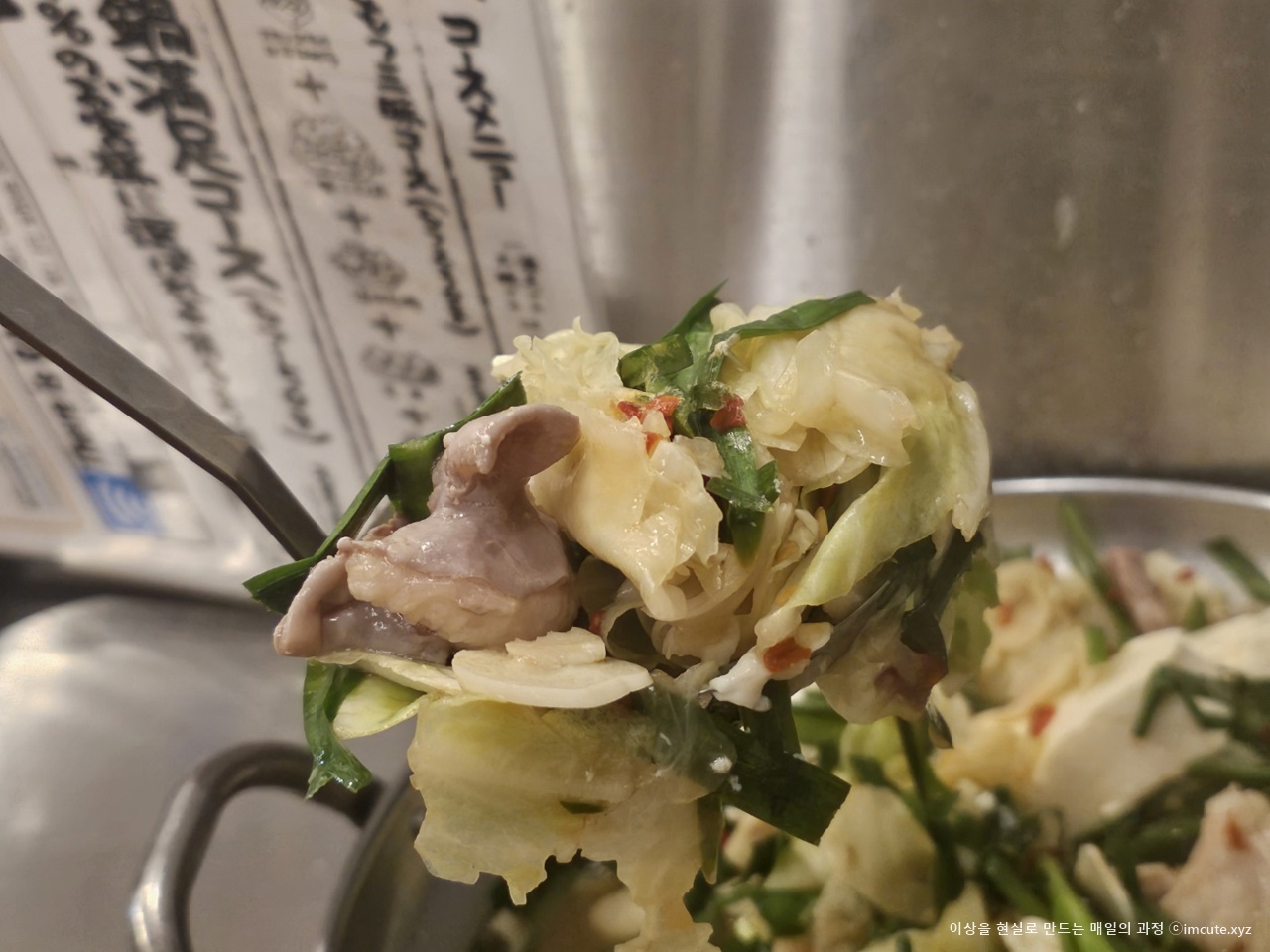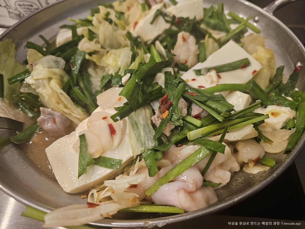 이렇게 부추가 산더미같이 쌓여있는 음식이 바로 모츠나베라고 합니다. 신기하쥬?