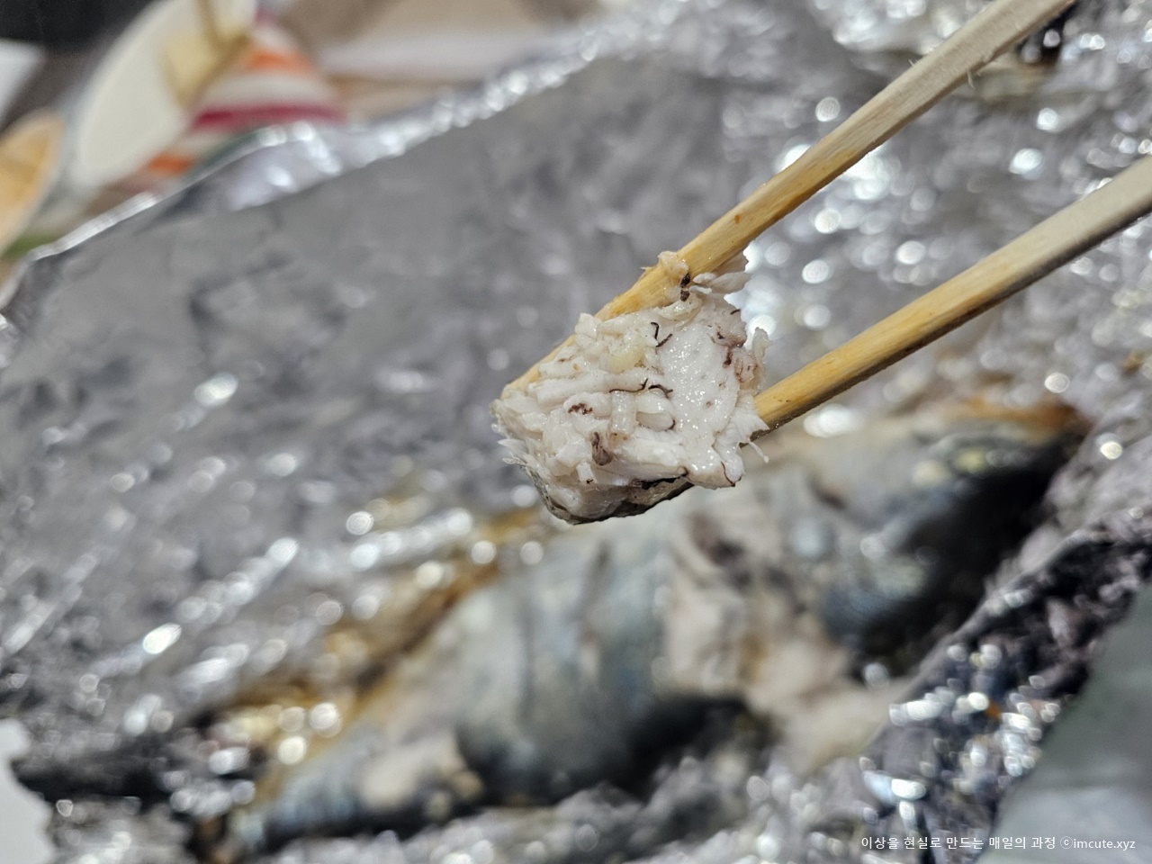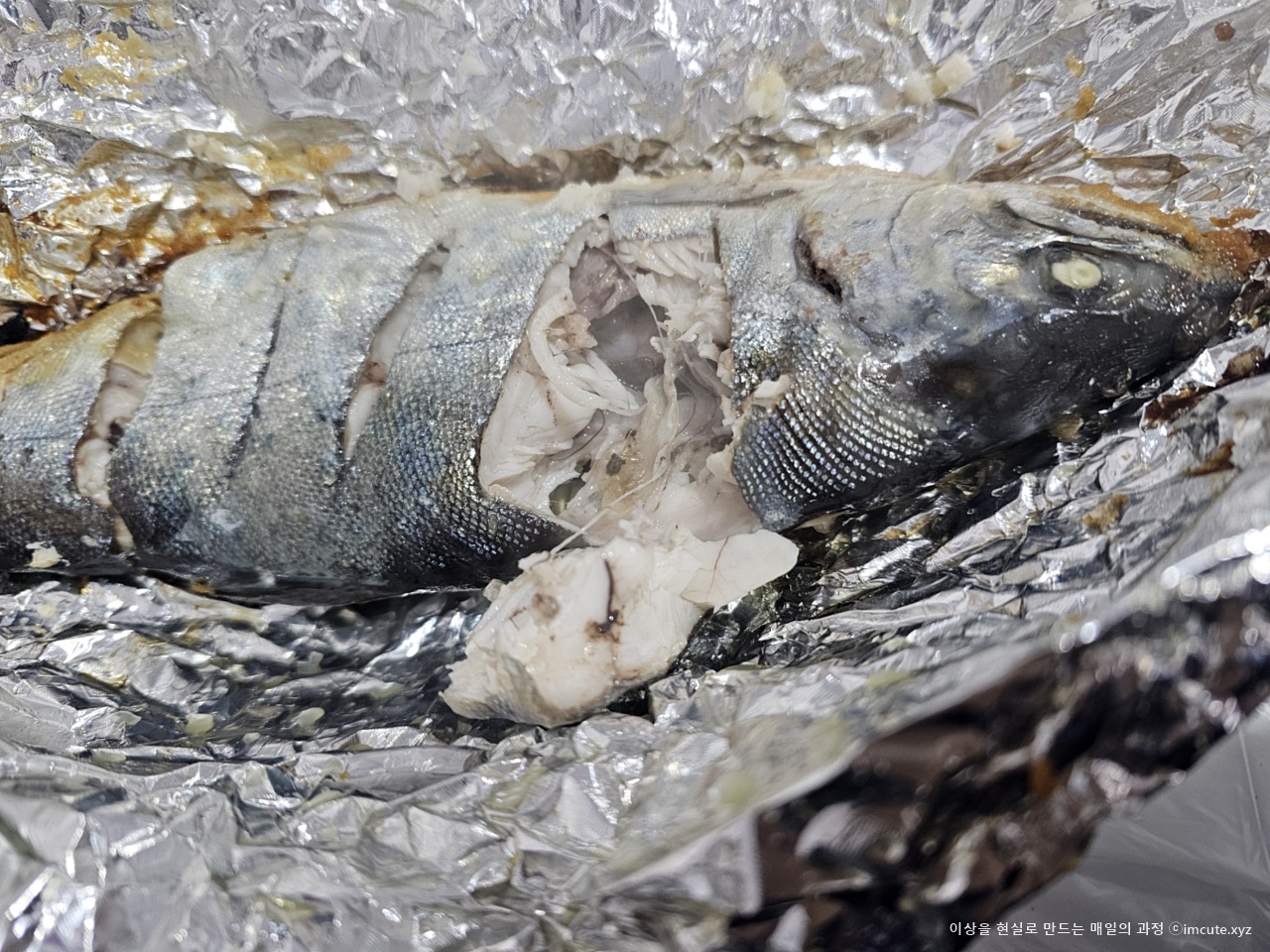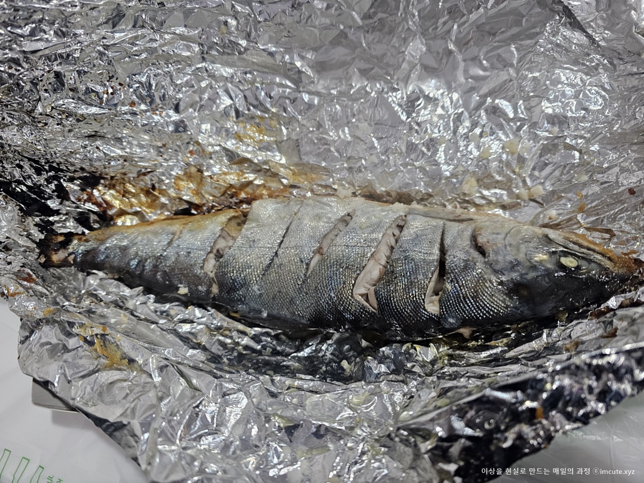 통통한 살코기가 기름이 쭉쭉 ... 정말 리치한 살결이고요. 그다음에 소금간이 짭짤한데 비린내가 나지 않아서 너무 신기했어요. 딱히 막 요리를 한거도 아니고 그냥 굽기만 한거 같은데 우째 이렇게 맛있지? 어두육미라고 해서 머리쪽 살코기가 제일 맛났답니다. 나 먹을줄 아는 사람이다 그래.