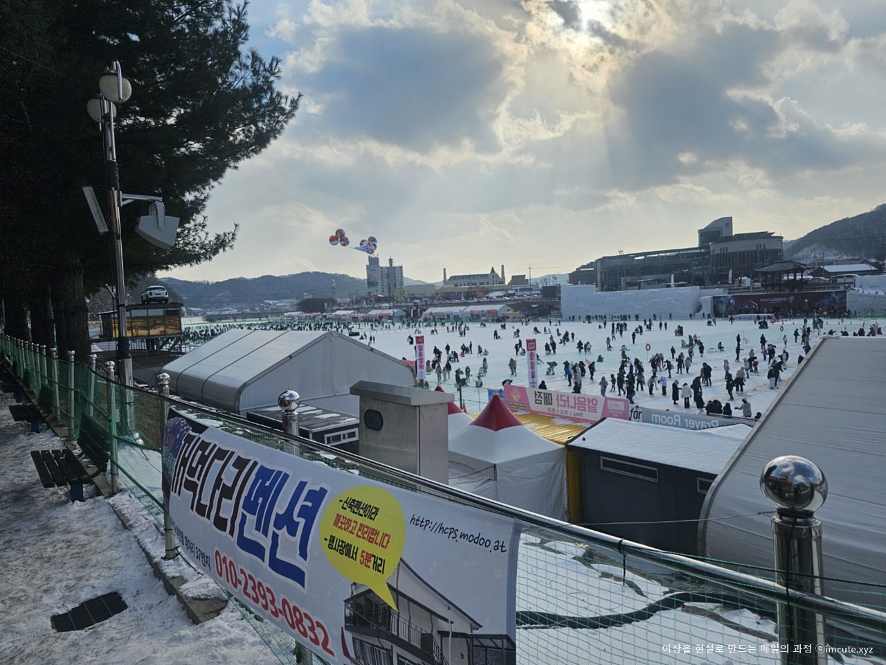 산천어축제에 참가한 날 날씨가 좋아서 더 좋았습니다. 가족, 연인단위로 참가한 사람들이 많아서 그런지 너무 보기 좋고~ 여행와서 이런곳에 오면 또 얼마나 큰 기쁨이겠어요. 보통 여행가면 도시만 다니게 되는데, 한적한 이런 곳에 오는것도 아주 낭만이 살아 있는거 같습니다. 그 와중에 최백호 낭만에 대하여 노래가 나와서 좋았음.