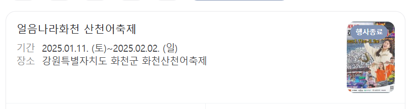 산천어축제에 가실분들은 축제의 이모저모, 즐길거리 살펴보시고 여러가지 액티비티에 도전해보시길 바라요~