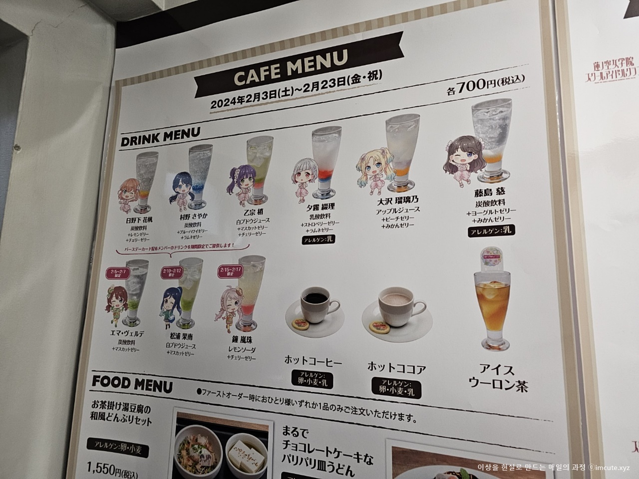 24년 2월 3일부터 2월 23일까지 했네요. 메뉴들은 러브라이브 캐릭터의 특성을 따서 만들어졌습니다.