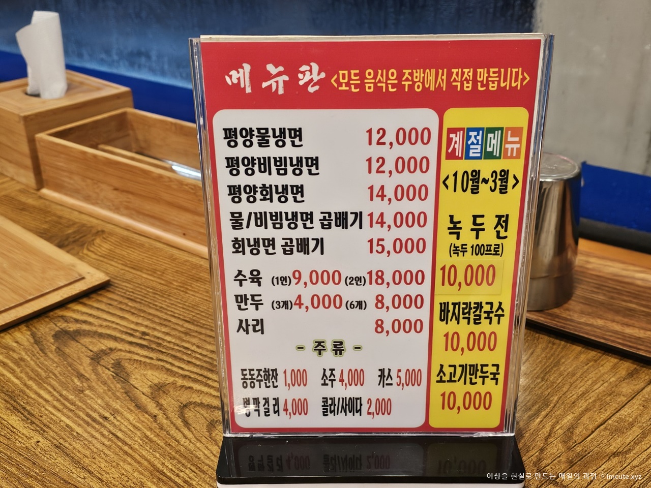 평양물냉면 가격이 12000원이라 합리적이면서도, 비빔냉면, 회냉면, 수육, 만두, 사리, 동동주, 막걸리가 있는 곳입니다.
