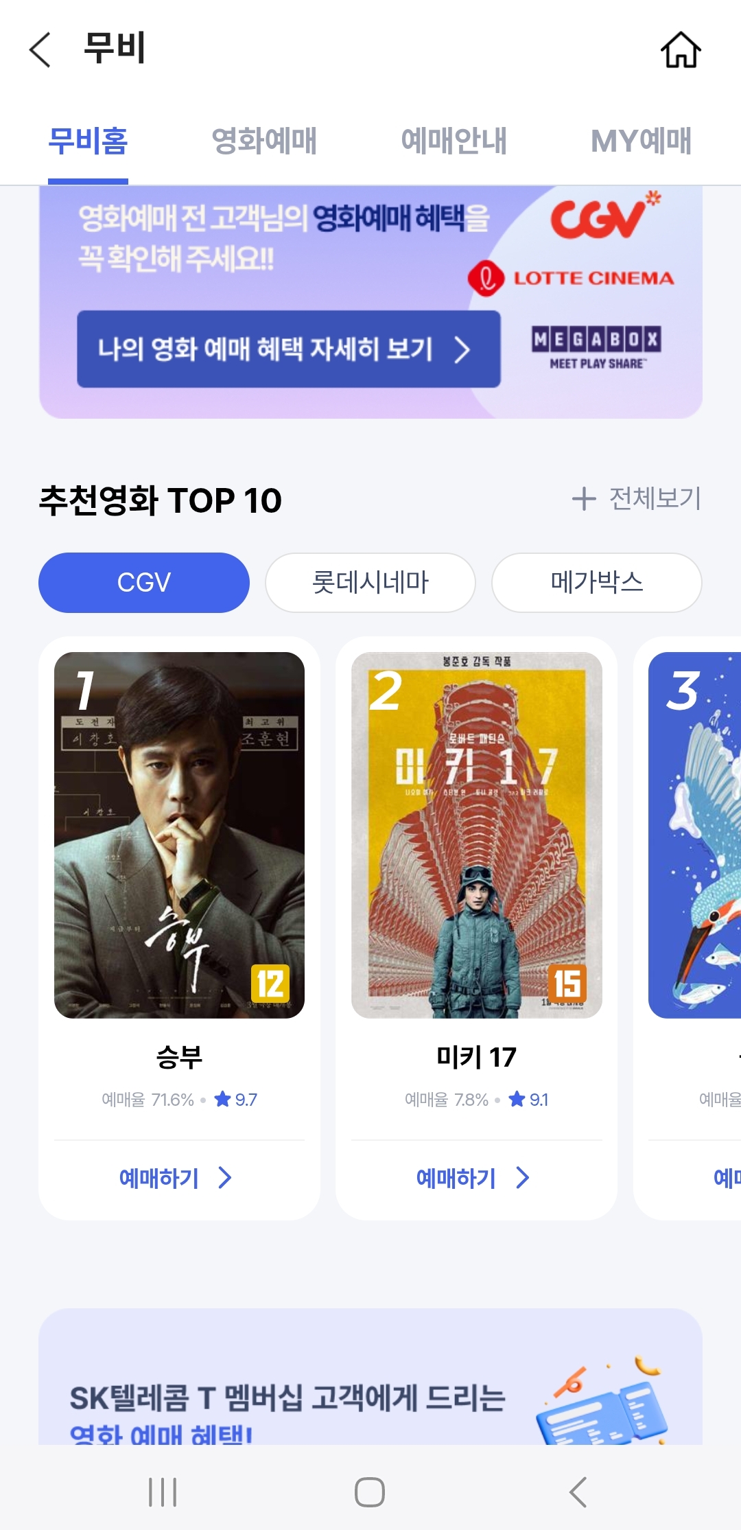 무비탭으로 들어가면 바로 극장별 예매하기가 뜨는데요