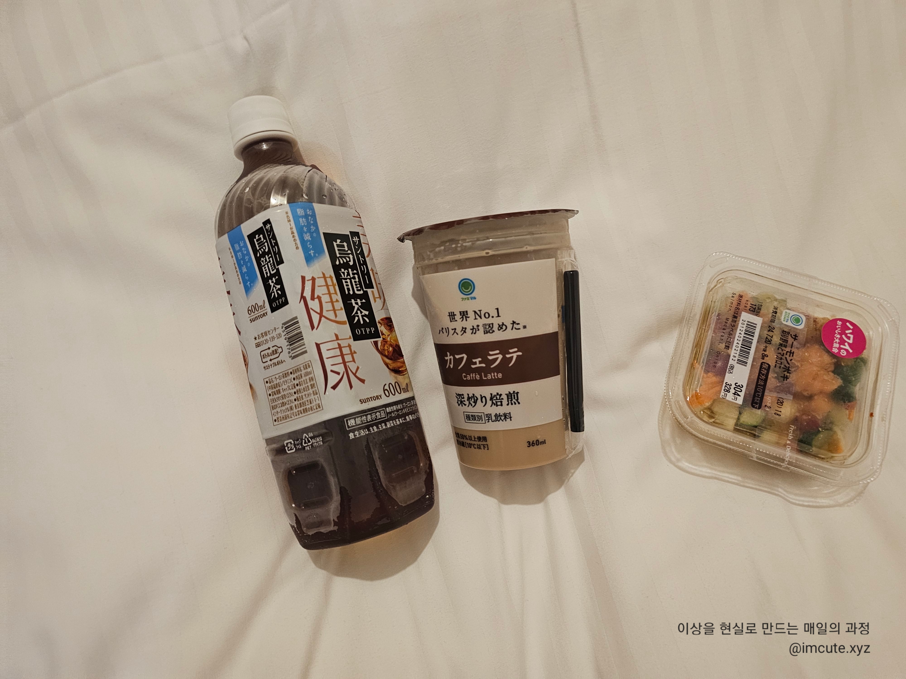 일본 오면 항상 사먹는 우롱차 그리고 카페라떼 우유, 샐러드입니다