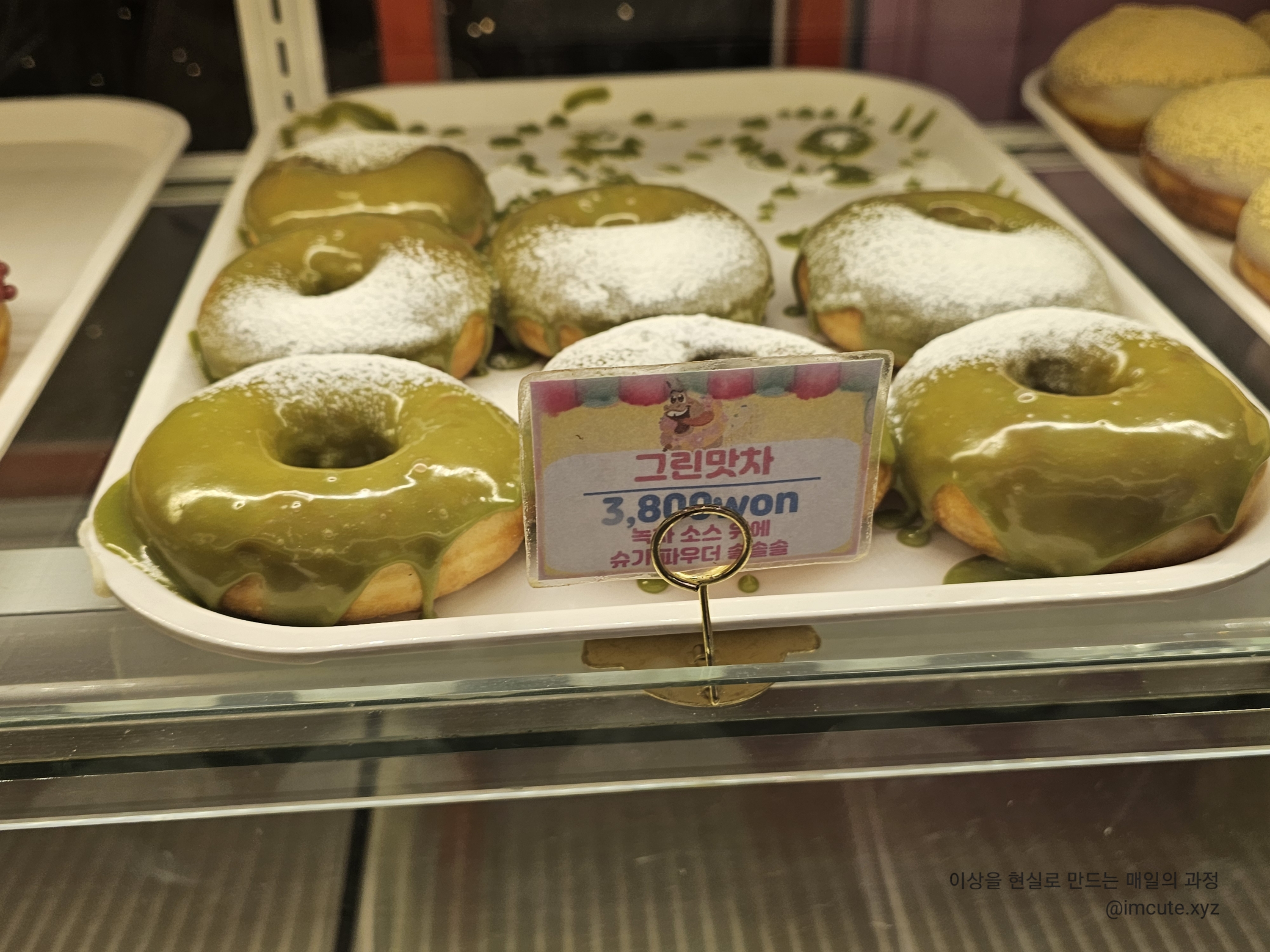 도너츠 위에 흘러내리듯이 녹차가 토핑이 되어 있는데 마치 그림처럼 예뻐 보여요