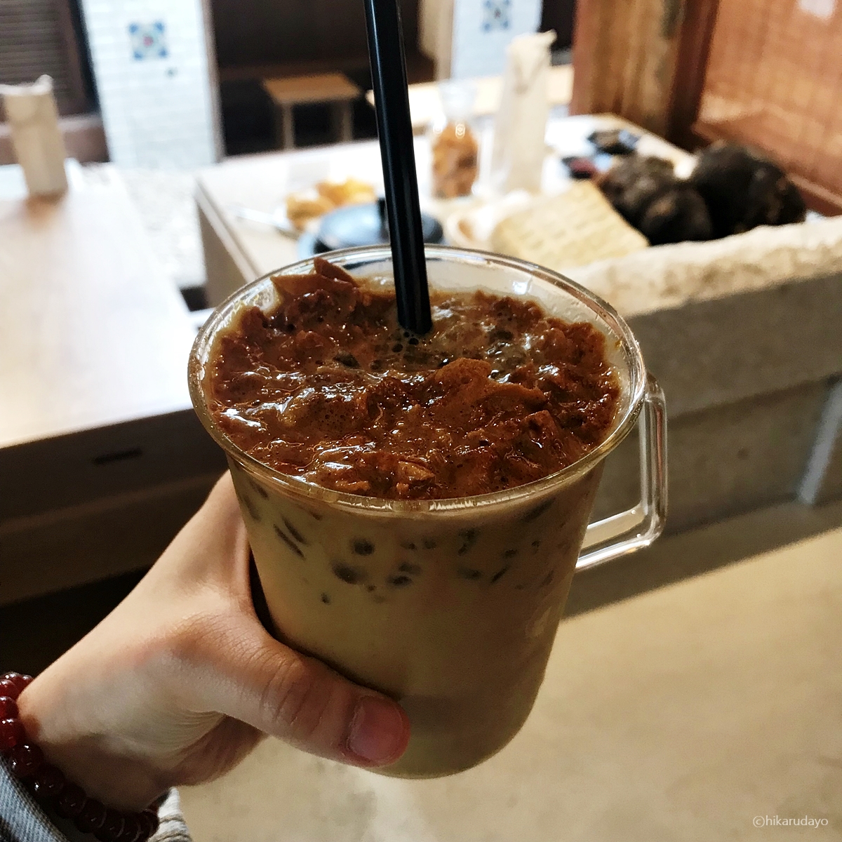 이 집은 술빵이 유명한데요 저기 천같은 것에 싸여져 있는 것이 바로 그것이에요. 막걸리로 만든 수제디저트라고 하네요. 물론 한국식 style이 살아있는 것도 그렇고요. 라떼는 흑당도 팔고 있지만 이 집에서 먹을수 있는 유명한 달고나라떼를 꼭 먹어보고 싶었어요. 익선동 ㅊa는 원래 성수동에서도 유명한 곳이었다 하는데 그런 명물 카페를 이곳에서도 마주할 수 있으니, 얼마나 기뻤는지 몰라요.