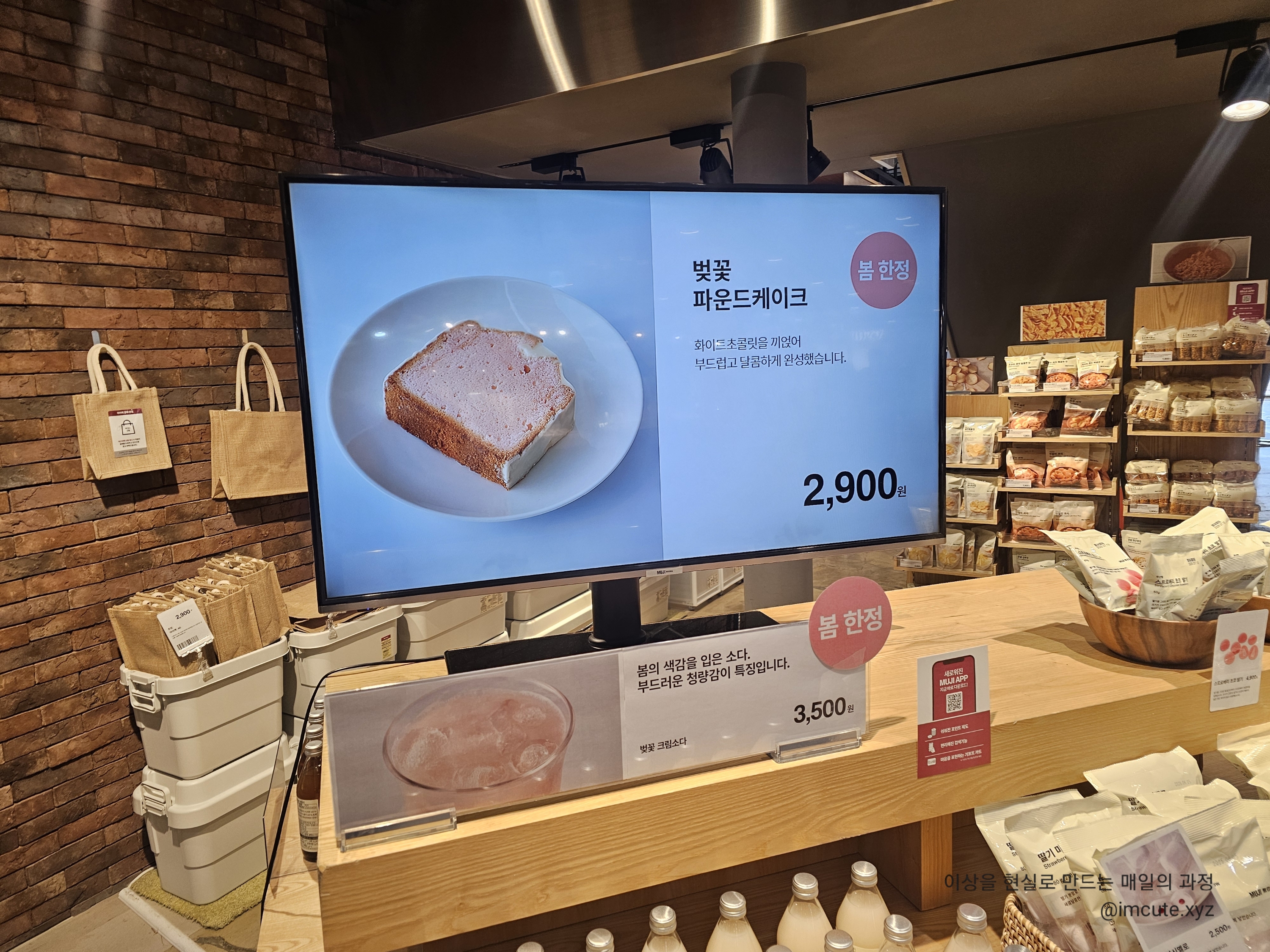 큰 TV광고로 벚꽃 파운드케이크 봄 한정 상품이 광고되고 있어요. 가격은 2900원.