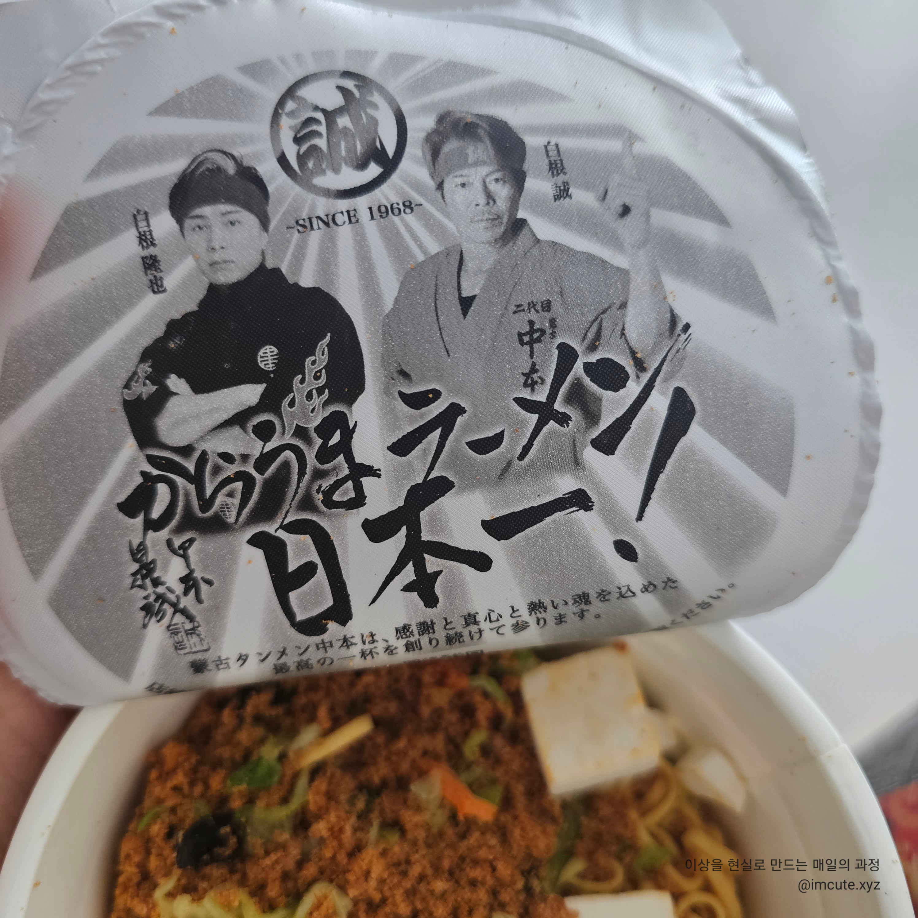 뭔가 일본 맛집 아저씨 같은 아저씨 두 명 사진이 컵라먼 뚜껑내부에 있어요