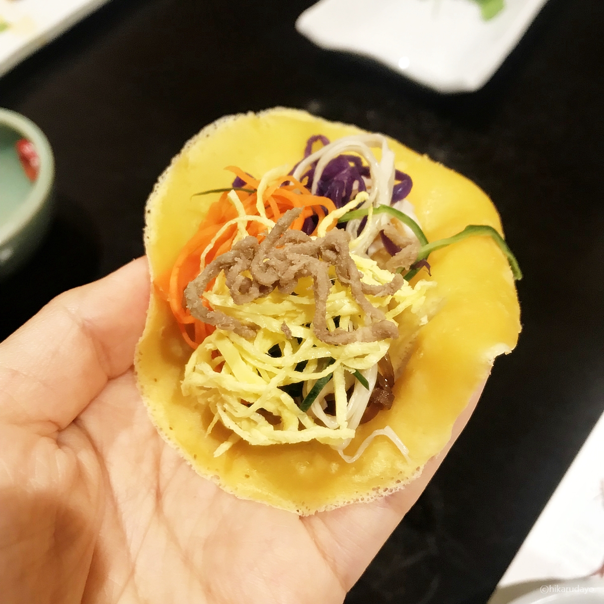 딱 한 점만 먹을 수 있는 구절판입니다. 2인분이니 알아서 나눠주시고요~ 세상에마상에. 외국에는 월남쌈이 있다면 한국에는 바로 요아이가 있습니다. 아주 잘게 고명이 채 썰어져 있는데요, 이런 밑반찬 만드는 것만 해도 엄청 수고스러울 거 같아요. 저는 전혀 엄두도 못 내는 것들이라, 더욱 감사하게 먹었음에는 분명합니다.