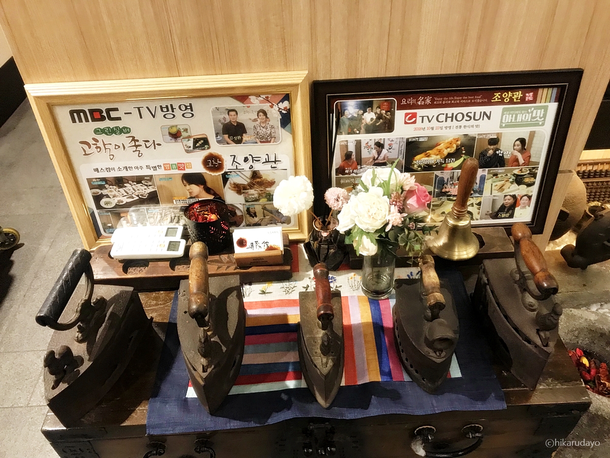같이 있는 장식품도 조선시대의 정취를 상기시켜 주기에 충분한 것들이었습니다. 옷감에 오색 천이라니요. 오방색은 아시다시피 한국의 상징이죠. 조양관에서 밥을 먹기 전부터 이 분위기에 압도되어 버리는 것은 왜였을까요.