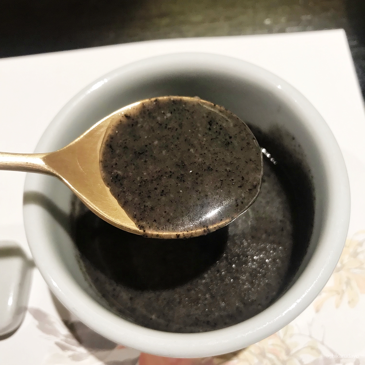 흑임자가 가득 들어간 것으로 예측되는 죽입니다. 전채요리이며 달지 않고 딱 깔금한 맛을 자아내더군요.