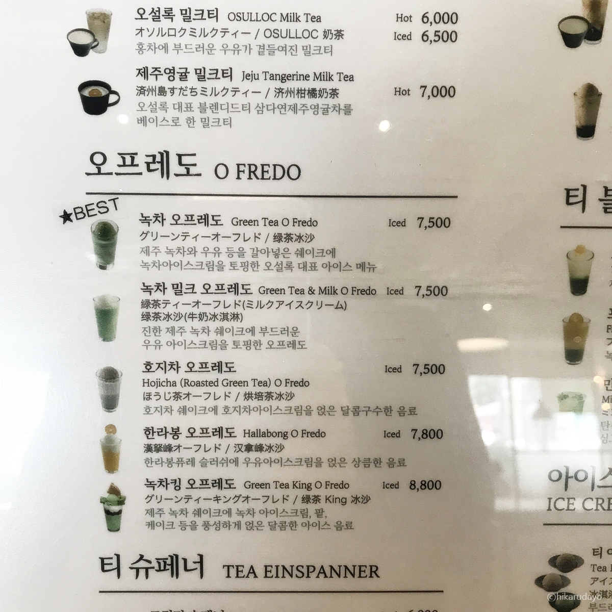 BEST는 녹차 오프레도이며 오프레도가 무엇인지 모르시는 분들께 귀띔 해드리자면, 오설록만의 고유한 메뉴로 '오'가 붙은 거 같고요. 약간 스무디같은 느낌입니다. 제주녹차우유를 갈아넣었다니 역시 오설록의 클라스는 알아주어야 하는군요. 오프레도 군단은 이에서 그치지 않고, 녹차 밀크오프레도와 호지차 오프레도 그리고 한라봉, 녹차킹 오프레도로 구성되어 있습니다. 같이 간 동생이 저보고 킹 먹으라던데 저는 날씬보가 되고싶어서 호지차를 먹기로 했습니다.