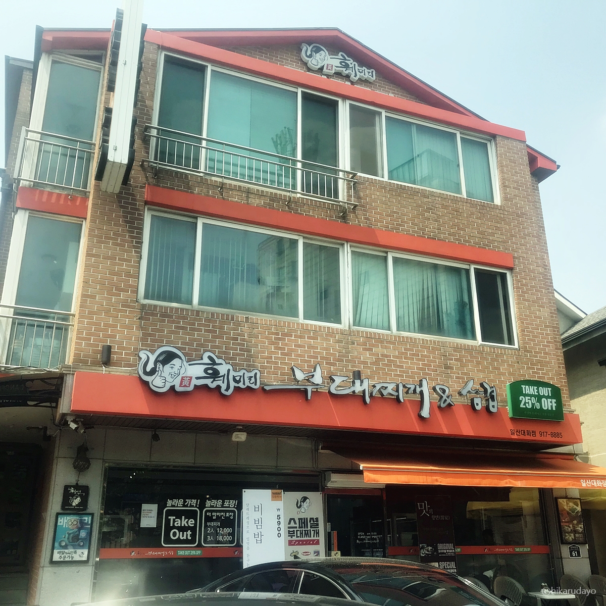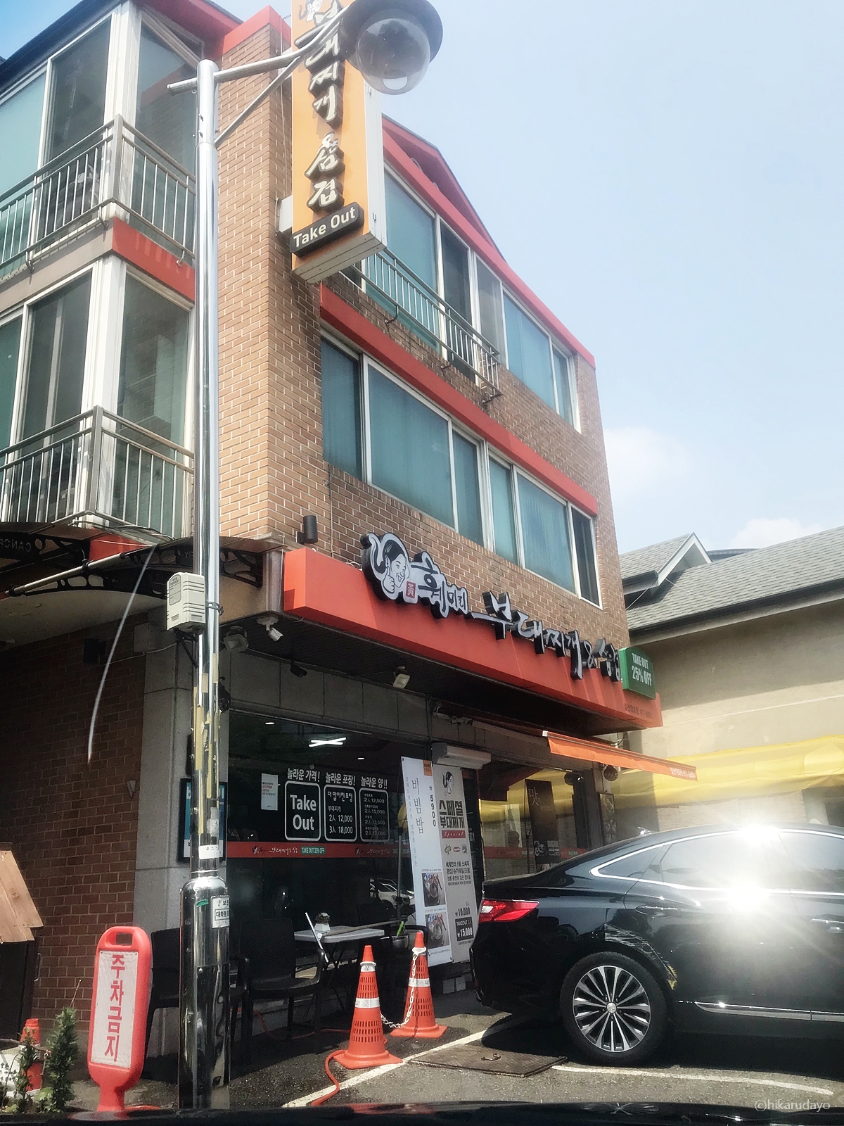 일산 훼미리부대찌개 대화점은 외관부터 Take Out(테이크아웃)을 강조하는 모양새였습니다. 포장 손님들이 정말 많다는 이 곳!! 실제로 지금같이 코로나로 위기상황이 봉착한 이 때에도 제품을 포장해 가져가시는 손님들이 저희 말고도 꽤 많더라고요. 아무래도 가족이 먹을 것을 전부 포장해 온 터라, 손이 부족해서 차를 몰고 갔는데요 잠깐 차 대기 좋게끔 앞에 주차 공간이 마련돼 있었습니다.