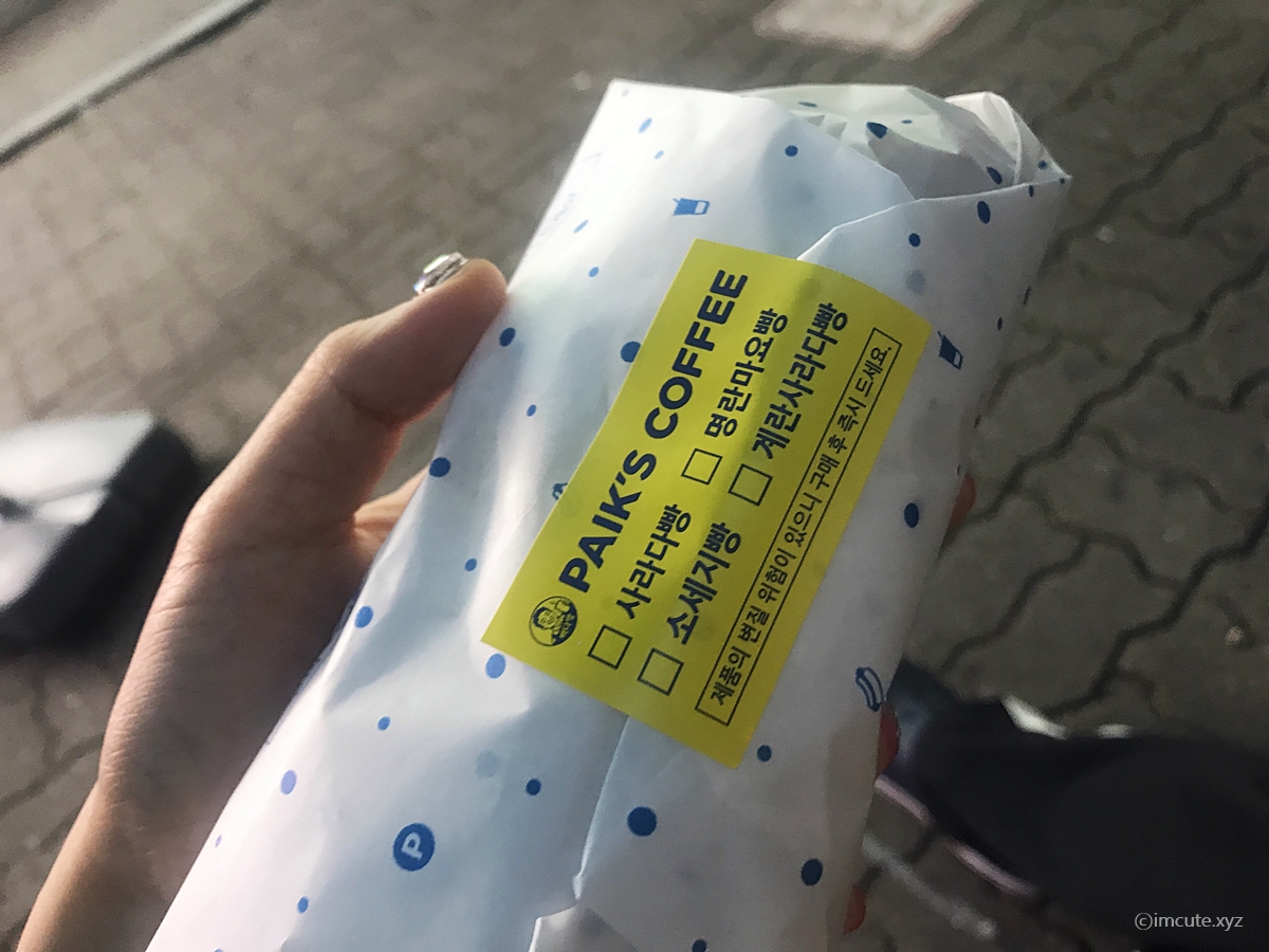이런 류의 빵으로는 명란마요빵이라든지 계란사라다빵, 소세지빵이 자매품이라고 알려 주는듯한 <스티커>도 붙어 있습니다. 노란색 배경에 파란 색이 빽다방의 상징 색깔, 즉 시그니처 컬러라는 것은 다 아실 겁니다.