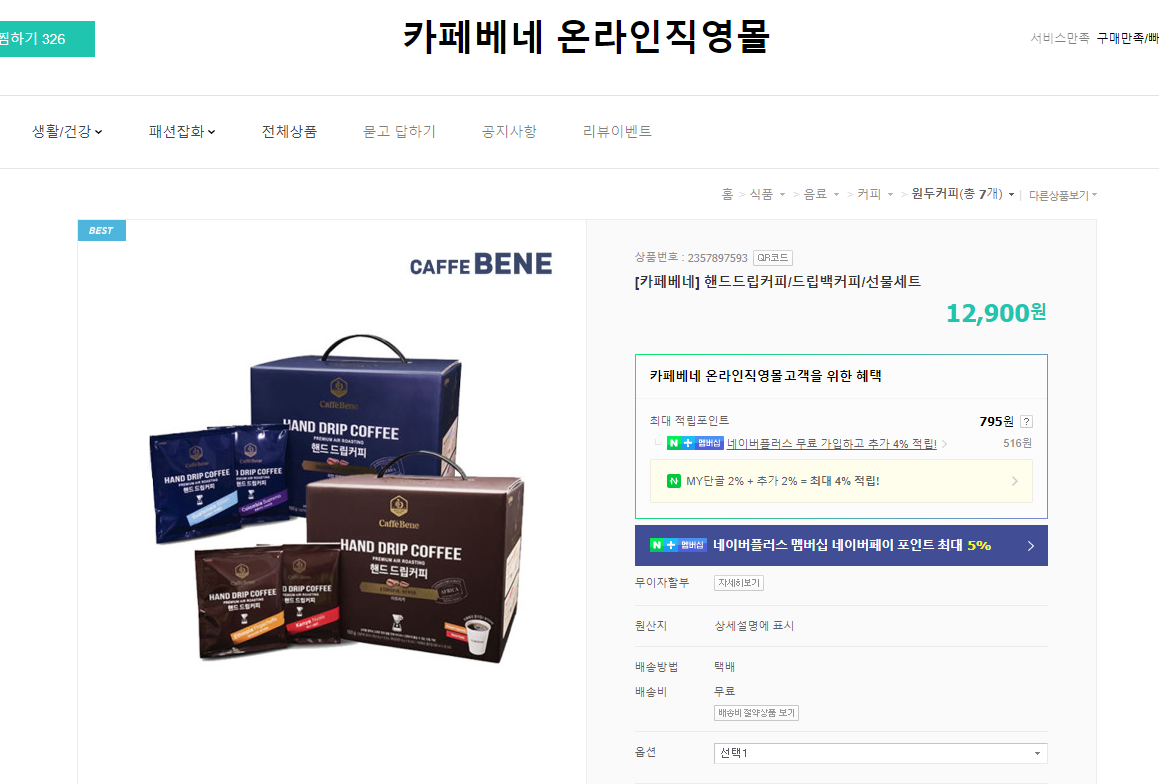 카페베네가 온라인 직영몰을 하고 있더라고요. 배송비는 무료인데, 가격은 단돈 1만 2천 900원이던 모습이었습니다. 네이버페이로 결제가 가능하고 그래서, 여러가지 혜택을 받아 구매하면 좀 더 저려미하게도 구매할 수 있지 않을까 합니다. (이 곳 말고도, 여러 사이트에서 구매가 가능했지만, 저는 여기서 구매했음을 알립니다.)