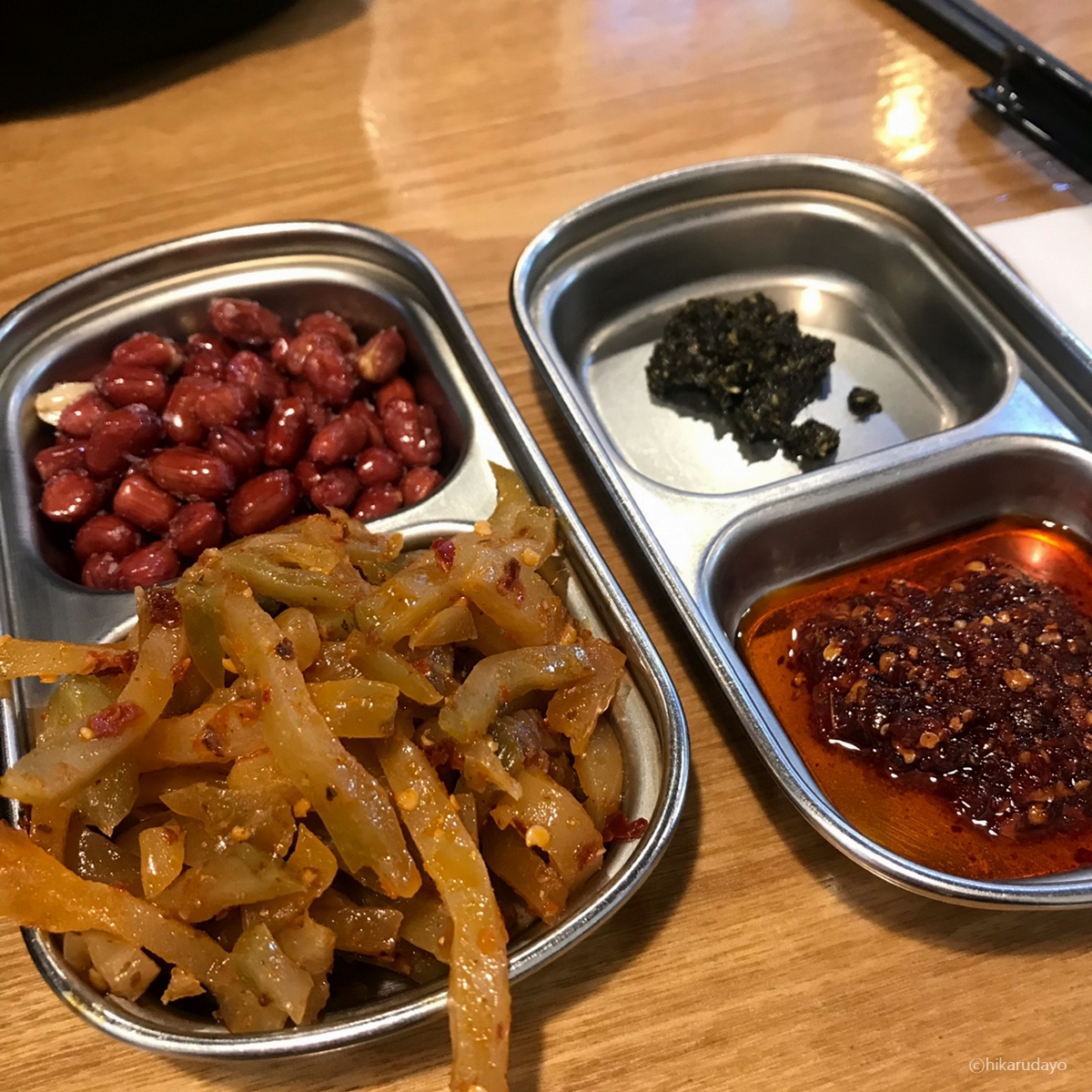 산초랑 빨간 고추기름, 짜샤이랑 땅콩이 있다.