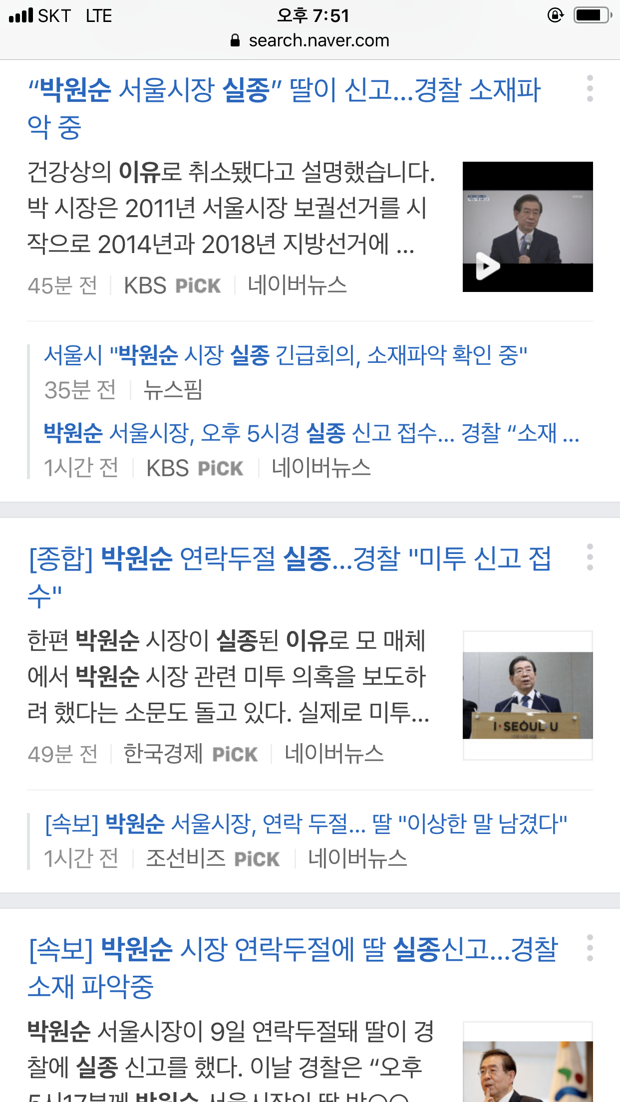 관련 뉴스까지 계속 뜨고 있다. KBS, YTN등 ... 어떻게 이런 유명인사가 혼자 모든 연락망을 끊어버리고 이렇게 소식이 두절될 수 있는지 모르겠다. 성북 일대를 지금 수색중이라고 하니 얼른 이 모든 사건이 해결되면 좋겠다는 생각이다. 박원순 실종 이유가 뭐가 됐건 사람의 생명은 소중하니, 일단 어떻게든 실종된 사람을 찾았으면 한다.