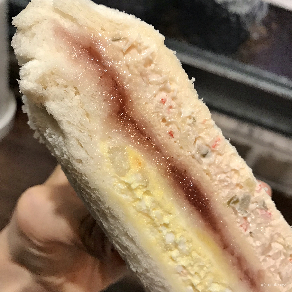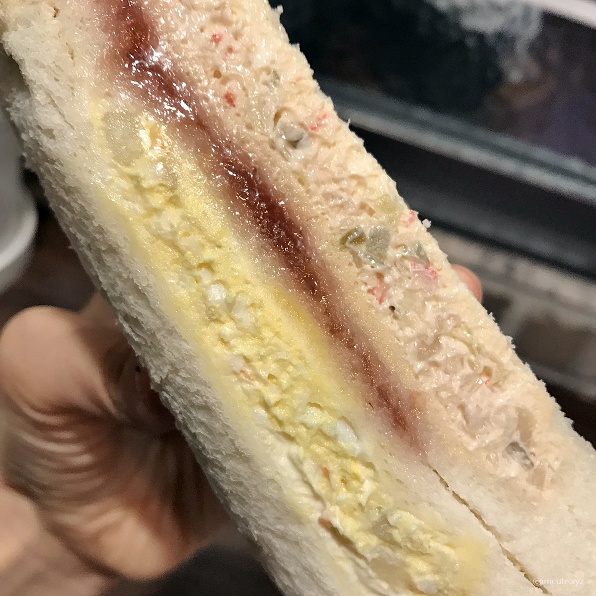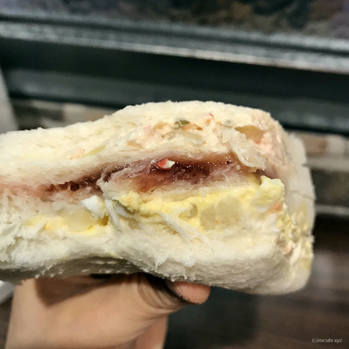 빵은 한개당 3겹이고요~ 빨간 딸기잼이 "나 좀 먹어봐"하고 외치는 듯 했습니다. 안은 단연 식빵이 포함되어 있고요(샌드위치이니까 말이죠) 밀은 미국산과 캐나다산의 혼합이었습니다. 쇼트닝은 인도네시아산이었고요. 내용물로는 마요네즈와 콩기름(대두유) 및 난황액, 딸기 슬라이스 등이 들어있습니다.