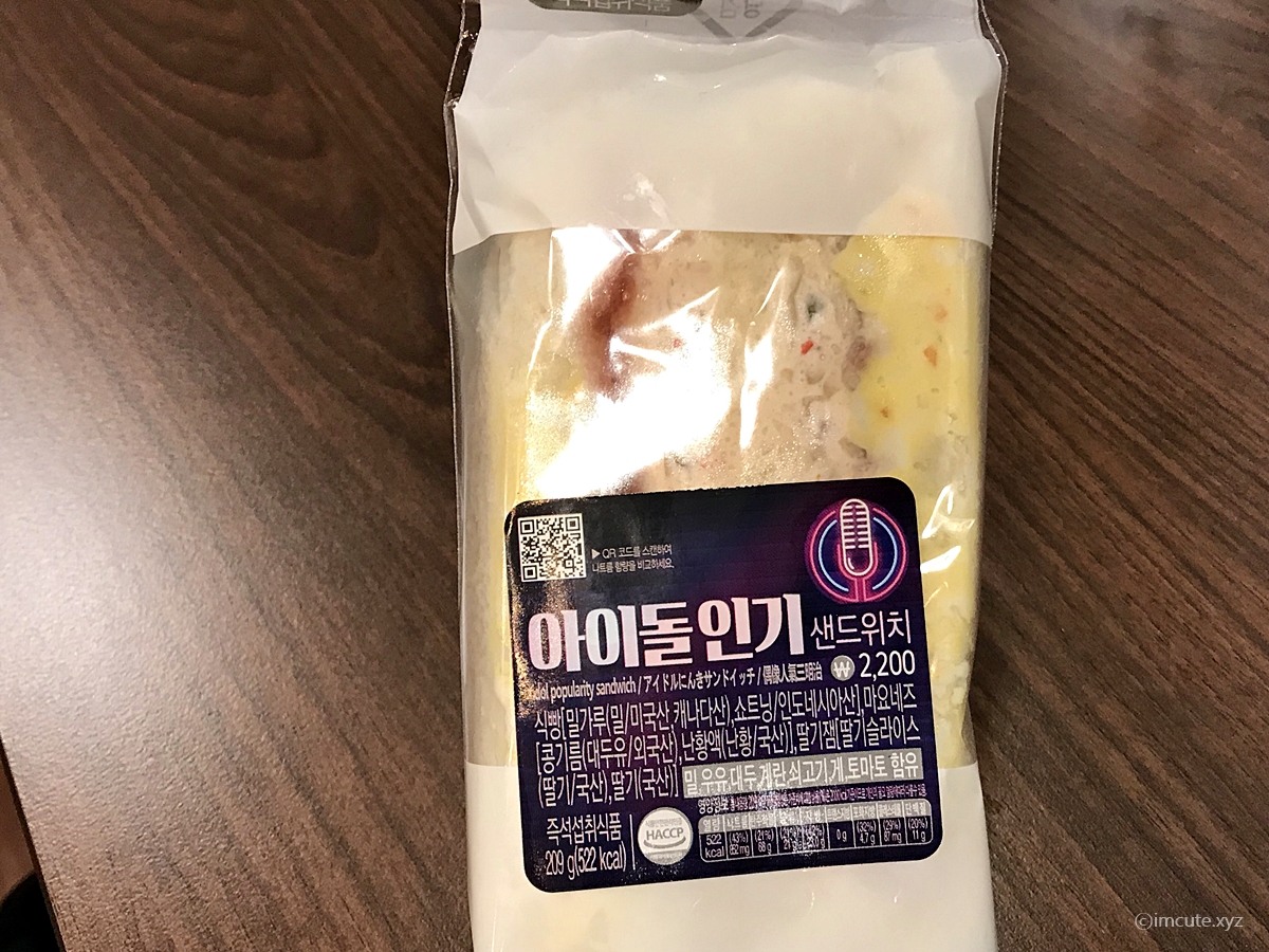 아이돌인기 샌드위치 가격은 2200원이고요, 편의점 샌드위치는 저렴하면서도 볼륨감이 있어서 쉬이 배가 불러 오더라고요. 그래서 잘 즐기고 있고요, 훈군덕에 맛볼 수가 있었습니다. ^^