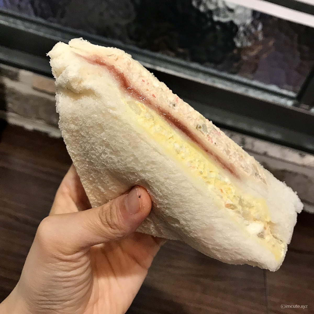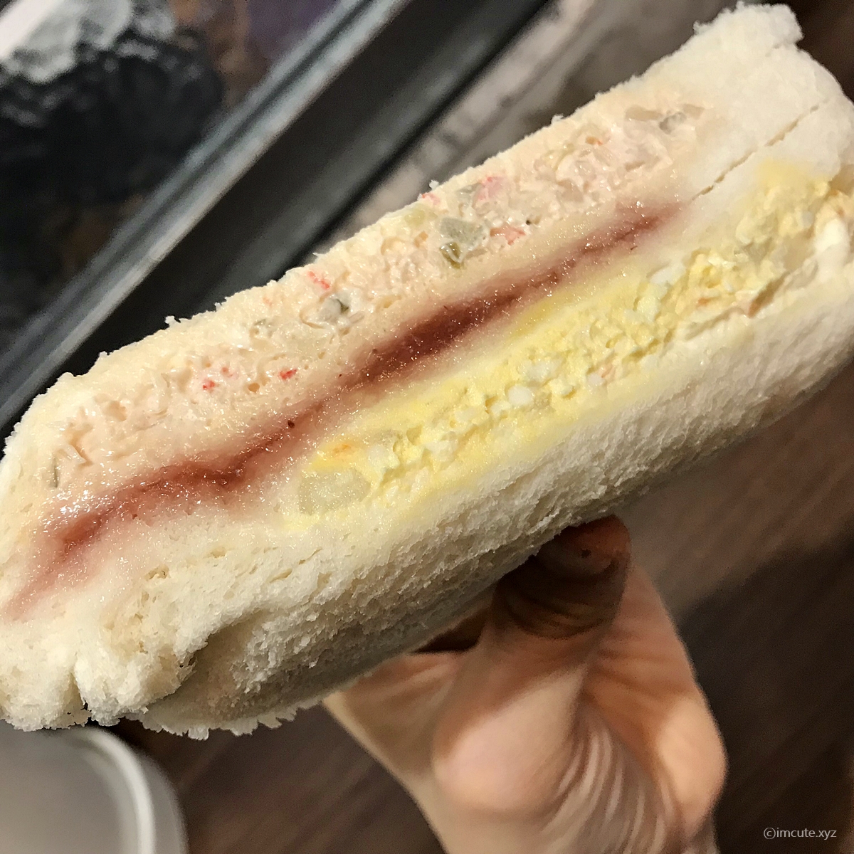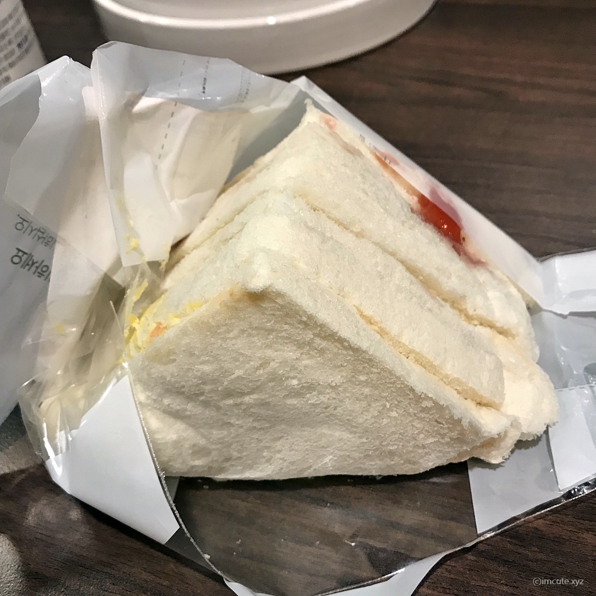 빵은 한개당 3겹이고요~ 빨간 딸기잼이 "나 좀 먹어봐"하고 외치는 듯 했습니다. 안은 단연 식빵이 포함되어 있고요(샌드위치이니까 말이죠) 밀은 미국산과 캐나다산의 혼합이었습니다. 쇼트닝은 인도네시아산이었고요. 내용물로는 마요네즈와 콩기름(대두유) 및 난황액, 딸기 슬라이스 등이 들어있습니다.